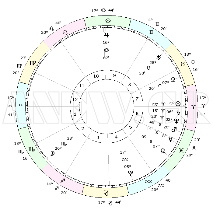 | | ΘΕΣΕΙΣ ΠΛΑΝΗΤΩΝ ΑΣΤΡΟΛΟΓΙΚΟΥ ΧΑΡΤΗ ΤΗΣ ΣΤΙΓΜΗΣ ΑΥΤΗΣ | | | | Πλανήτης | Ζώδιο | Μοίρες | Δεκαήμ. | Σε οίκο | Απόκλιση | | Ακμές των οίκων | | Ηλιος | Κριός | 15°47' | Δεύτερο | 8 | 06 N 12 | | 1ος | 04°25' | Παρθένος | | Σελήνη | Σκορπιός | 24°57' | Τρίτο | 3 | 23 S 52 | | 2ος | 28°44' | Παρθένος | | Ερμής | Ιχθείς | 18°05' | Δεύτερο | 7 | 06 S 29 | | 3ος | 27°47' | Ζυγός | | Αφροδίτη | Ταύρος | 07°15' | Πρώτο | 9 | 13 N 42 | | 4ος | 00°43' | Τοξότης | | Αρης | Ιχθείς | 26°41' | Τρίτο | 7 | 02 S 15 | | 5ος | 04°38' | Αιγόκερως | | Δίας | Καρκίνος | 16°06' | Δεύτερο | 11 | 22 N 50 | | 6ος | 06°16' | Υδροχόος | | Κρόνος | Κριός | 06°14' | Πρώτο | 8 | 00 N 31 | | 7ος | 04°25' | Ιχθείς | | Ουρανός | Ταύρος | 28°58' | Τρίτο | 9 | 19 N 45 | | 8ος | 28°44' | Ιχθείς | | Ποσειδώνας | Κριός | 02°23' | Πρώτο | 8 | 00 S 15 | | 9ος | 27°46' | Κριός | | Πλούτωνας | Υδροχόος | 05°17' | Πρώτο | 5 | 22 S 47 | | 10ος | 00°43' | Δίδυμοι | | Β. Δεσμός | Ιχθείς | 07°10' | Πρώτο | 7 | 08 S 53 | | 11ος | 04°38' | Καρκίνος | | Ωροσκόπος | Παρθένος | 04°25' | Πρώτο | | | 12ος | 06°16' | Λέων | | Μεσουράνημα | Δίδυμοι | 00°43' | Πρώτο | | | |