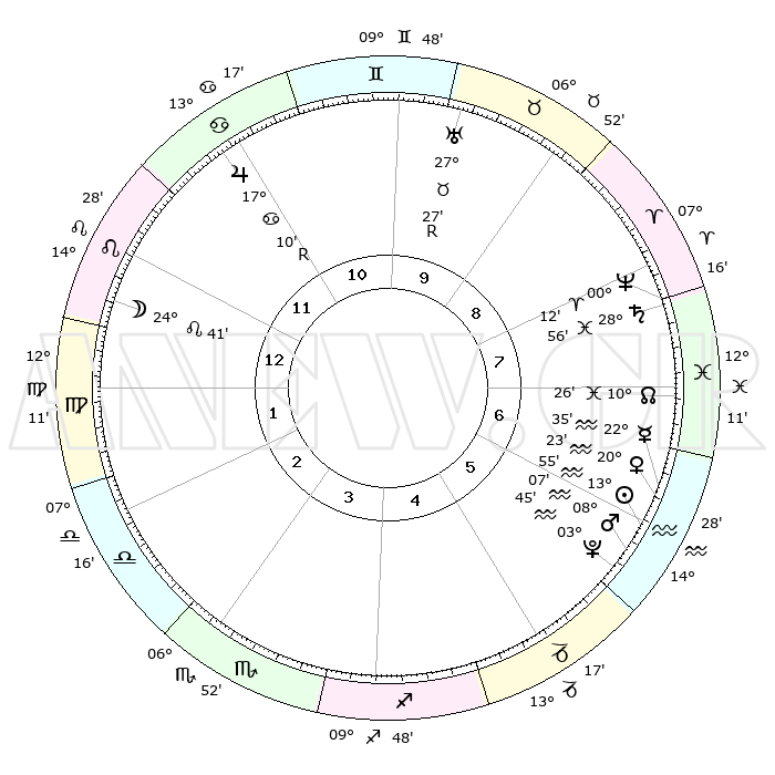 | | ΘΕΣΕΙΣ ΠΛΑΝΗΤΩΝ ΑΣΤΡΟΛΟΓΙΚΟΥ ΧΑΡΤΗ ΤΗΣ ΣΤΙΓΜΗΣ ΑΥΤΗΣ | | | | Πλανήτης | Ζώδιο | Μοίρες | Δεκαήμ. | Σε οίκο | Απόκλιση | | Ακμές των οίκων | | Ηλιος | Υδροχόος | 13°51' | Δεύτερο | 6 | 16 S 40 | | 1ος | 24°34' | Λέων | | Σελήνη | Λέων | 23°51' | Τρίτο | 12 | 14 N 52 | | 2ος | 17°51' | Παρθένος | | Ερμής | Υδροχόος | 22°29' | Τρίτο | 6 | 15 S 41 | | 3ος | 15°59' | Ζυγός | | Αφροδίτη | Υδροχόος | 20°19' | Τρίτο | 6 | 16 S 01 | | 4ος | 18°48' | Σκορπιός | | Αρης | Υδροχόος | 08°04' | Πρώτο | 6 | 19 S 16 | | 5ος | 23°23' | Τοξότης | | Δίας | Καρκίνος | 17°10'R | Δεύτερο | 11 | 22 N 38 | | 6ος | 25°48' | Αιγόκερως | | Κρόνος | Ιχθείς | 28°56' | Τρίτο | 8 | 02 S 25 | | 7ος | 24°34' | Υδροχόος | | Ουρανός | Ταύρος | 27°27'R | Τρίτο | 10 | 19 N 24 | | 8ος | 17°51' | Ιχθείς | | Ποσειδώνας | Κριός | 00°11' | Πρώτο | 8 | 01 S 08 | | 9ος | 15°59' | Κριός | | Πλούτωνας | Υδροχόος | 03°45' | Πρώτο | 6 | 23 S 01 | | 10ος | 18°48' | Ταύρος | | Β. Δεσμός | Ιχθείς | 10°26' | Δεύτερο | 7 | 07 S 39 | | 11ος | 23°23' | Δίδυμοι | | Ωροσκόπος | Λέων | 24°34' | Τρίτο | | | 12ος | 25°48' | Καρκίνος | | Μεσουράνημα | Ταύρος | 18°48' | Δεύτερο | | | |