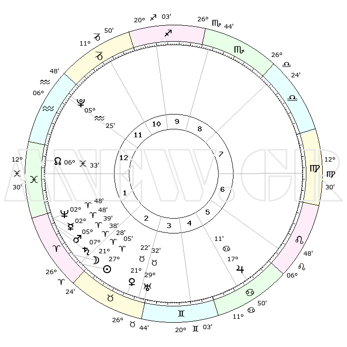 | | ΘΕΣΕΙΣ ΠΛΑΝΗΤΩΝ ΑΣΤΡΟΛΟΓΙΚΟΥ ΧΑΡΤΗ ΤΗΣ ΣΤΙΓΜΗΣ ΑΥΤΗΣ | | | | Πλανήτης | Ζώδιο | Μοίρες | Δεκαήμ. | Σε οίκο | Απόκλιση | | Ακμές των οίκων | | Ηλιος | Κριός | 27°02' | Τρίτο | 2 | 10 N 25 | | 1ος | 09°16' | Υδροχόος | | Σελήνη | Κριός | 20°32' | Τρίτο | 2 | 11 N 14 | | 2ος | 24°34' | Ιχθείς | | Ερμής | Κριός | 02°42' | Πρώτο | 2 | 01 S 20 | | 3ος | 01°24' | Ταύρος | | Αφροδίτη | Ταύρος | 21°18' | Τρίτο | 3 | 18 N 20 | | 4ος | 28°22' | Ταύρος | | Αρης | Κριός | 05°36' | Πρώτο | 2 | 01 N 20 | | 5ος | 20°34' | Δίδυμοι | | Δίας | Καρκίνος | 17°11' | Δεύτερο | 6 | 22 N 42 | | 6ος | 12°25' | Καρκίνος | | Κρόνος | Κριός | 07°38' | Πρώτο | 2 | 01 N 03 | | 7ος | 09°16' | Λέων | | Ουρανός | Ταύρος | 29°32' | Τρίτο | 4 | 19 N 53 | | 8ος | 24°34' | Παρθένος | | Ποσειδώνας | Κριός | 02°48' | Πρώτο | 2 | 00 S 06 | | 9ος | 01°24' | Σκορπιός | | Πλούτωνας | Υδροχόος | 05°25' | Πρώτο | 12 | 22 S 47 | | 10ος | 28°22' | Σκορπιός | | Β. Δεσμός | Ιχθείς | 06°33' | Πρώτο | 1 | 09 S 06 | | 11ος | 20°34' | Τοξότης | | Ωροσκόπος | Υδροχόος | 09°16' | Πρώτο | | | 12ος | 12°25' | Αιγόκερως | | Μεσουράνημα | Σκορπιός | 28°22' | Τρίτο | | | |