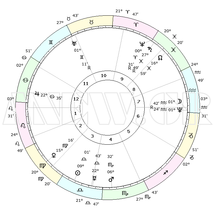 | ΘΕΣΕΙΣ ΠΛΑΝΗΤΩΝ ΑΣΤΡΟΛΟΓΙΚΟΥ ΧΑΡΤΗ ΤΗΣ ΣΤΙΓΜΗΣ ΑΥΤΗΣ | | Πλανήτης | Ζώδιο | Μοίρες | Δεκαήμ. | Σε οίκο | Απόκλιση | | Ακμές των οίκων | Ηλιος | Ζυγός | 08°58' | Πρώτο | 4 | 03 S 33 | | 1ος | 17°30' | Καρκίνος | Σελήνη | Υδροχόος | 00°60' | Πρώτο | 7 | 23 S 42 | | 2ος | 07°59' | Λέων | Ερμής | Ζυγός | 22°38' | Τρίτο | 4 | 09 S 00 | | 3ος | 01°25' | Παρθένος | Αφροδίτη | Παρθένος | 15°12' | Δεύτερο | 3 | 07 N 02 | | 4ος | 00°38' | Ζυγός | Αρης | Σκορπιός | 06°29' | Πρώτο | 4 | 13 S 46 | | 5ος | 06°31' | Σκορπιός | Δίας | Καρκίνος | 22°35' | Τρίτο | 1 | 21 N 34 | | 6ος | 14°19' | Τοξότης | Κρόνος | Ιχθείς | 27°49'R | Τρίτο | 9 | 03 S 10 | | 7ος | 17°30' | Αιγόκερως | Ουρανός | Δίδυμοι | 01°11'R | Πρώτο | 11 | 20 N 11 | | 8ος | 07°59' | Υδροχόος | Ποσειδώνας | Κριός | 00°31'R | Πρώτο | 9 | 01 S 03 | | 9ος | 01°25' | Ιχθείς | Πλούτωνας | Υδροχόος | 01°24'R | Πρώτο | 7 | 23 S 32 | | 10ος | 00°38' | Κριός | Β. Δεσμός | Ιχθείς | 16°60' | Δεύτερο | 9 | 05 S 08 | | 11ος | 06°31' | Ταύρος | Ωροσκόπος | Καρκίνος | 17°30' | Δεύτερο | | | 12ος | 14°19' | Δίδυμοι | Μεσουράνημα | Κριός | 00°38' | Πρώτο | | | |