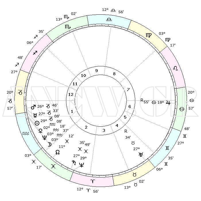 | | ΘΕΣΕΙΣ ΠΛΑΝΗΤΩΝ ΑΣΤΡΟΛΟΓΙΚΟΥ ΧΑΡΤΗ ΤΗΣ ΣΤΙΓΜΗΣ ΑΥΤΗΣ | | | | Πλανήτης | Ζώδιο | Μοίρες | Δεκαήμ. | Σε οίκο | Απόκλιση | | Ακμές των οίκων | | Ηλιος | Αιγόκερως | 29°04' | Τρίτο | 1 | 20 S 20 | | 1ος | 27°45' | Τοξότης | | Σελήνη | Υδροχόος | 02°48' | Πρώτο | 1 | 22 S 32 | | 2ος | 04°20' | Υδροχόος | | Ερμής | Αιγόκερως | 27°27' | Τρίτο | 1 | 22 S 37 | | 3ος | 14°09' | Ιχθείς | | Αφροδίτη | Υδροχόος | 02°03' | Πρώτο | 1 | 20 S 46 | | 4ος | 18°27' | Κριός | | Αρης | Αιγόκερως | 26°43' | Τρίτο | 1 | 21 S 47 | | 5ος | 15°07' | Ταύρος | | Δίας | Καρκίνος | 18°56'R | Δεύτερο | 7 | 22 N 22 | | 6ος | 07°05' | Δίδυμοι | | Κρόνος | Ιχθείς | 27°35' | Τρίτο | 3 | 02 S 59 | | 7ος | 27°45' | Δίδυμοι | | Ουρανός | Ταύρος | 27°34'R | Τρίτο | 5 | 19 N 25 | | 8ος | 04°20' | Λέων | | Ποσειδώνας | Ιχθείς | 29°49' | Τρίτο | 3 | 01 S 17 | | 9ος | 14°09' | Παρθένος | | Πλούτωνας | Υδροχόος | 03°17' | Πρώτο | 1 | 23 S 06 | | 10ος | 18°27' | Ζυγός | | Β. Δεσμός | Ιχθείς | 11°12' | Δεύτερο | 2 | 07 S 22 | | 11ος | 15°07' | Σκορπιός | | Ωροσκόπος | Τοξότης | 27°45' | Τρίτο | | | 12ος | 07°05' | Τοξότης | | Μεσουράνημα | Ζυγός | 18°27' | Δεύτερο | | | |