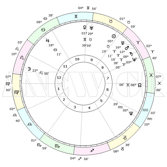 | | ΘΕΣΕΙΣ ΠΛΑΝΗΤΩΝ ΑΣΤΡΟΛΟΓΙΚΟΥ ΧΑΡΤΗ ΤΗΣ ΣΤΙΓΜΗΣ ΑΥΤΗΣ | | | | Πλανήτης | Ζώδιο | Μοίρες | Δεκαήμ. | Σε οίκο | Απόκλιση | | Ακμές των οίκων | | Ηλιος | Ταύρος | 05°16' | Πρώτο | 9 | 13 N 16 | | 1ος | 20°25' | Λέων | | Σελήνη | Λέων | 22°12' | Τρίτο | 1 | 15 N 22 | | 2ος | 13°16' | Παρθένος | | Ερμής | Κριός | 16°05' | Δεύτερο | 9 | 04 N 06 | | 3ος | 10°57' | Ζυγός | | Αφροδίτη | Δίδυμοι | 01°34' | Πρώτο | 10 | 21 N 06 | | 4ος | 13°38' | Σκορπιός | | Αρης | Κριός | 12°07' | Δεύτερο | 9 | 03 N 56 | | 5ος | 18°31' | Τοξότης | | Δίας | Καρκίνος | 18°11' | Δεύτερο | 11 | 22 N 35 | | 6ος | 21°22' | Αιγόκερως | | Κρόνος | Κριός | 08°38' | Πρώτο | 8 | 01 N 26 | | 7ος | 20°25' | Υδροχόος | | Ουρανός | Ταύρος | 29°58' | Τρίτο | 10 | 19 N 59 | | 8ος | 13°16' | Ιχθείς | | Ποσειδώνας | Κριός | 03°05' | Πρώτο | 8 | 00 N 01 | | 9ος | 10°57' | Κριός | | Πλούτωνας | Υδροχόος | 05°29' | Πρώτο | 6 | 22 S 48 | | 10ος | 13°38' | Ταύρος | | Β. Δεσμός | Ιχθείς | 06°06' | Πρώτο | 7 | 09 S 16 | | 11ος | 18°31' | Δίδυμοι | | Ωροσκόπος | Λέων | 20°25' | Τρίτο | | | 12ος | 21°22' | Καρκίνος | | Μεσουράνημα | Ταύρος | 13°38' | Δεύτερο | | | |