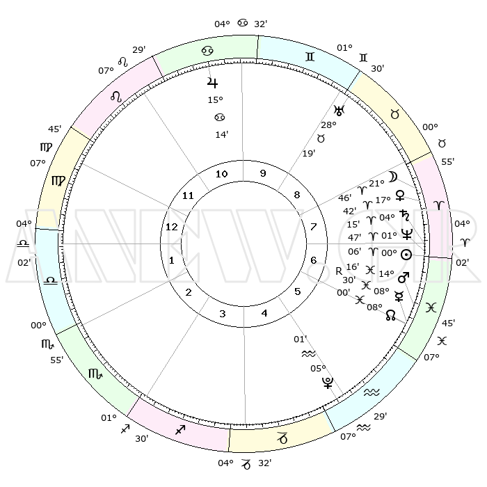| | ΘΕΣΕΙΣ ΠΛΑΝΗΤΩΝ ΑΣΤΡΟΛΟΓΙΚΟΥ ΧΑΡΤΗ ΤΗΣ ΣΤΙΓΜΗΣ ΑΥΤΗΣ | | | | Πλανήτης | Ζώδιο | Μοίρες | Δεκαήμ. | Σε οίκο | Απόκλιση | | Ακμές των οίκων | | Ηλιος | Κριός | 00°01' | Πρώτο | 7 | 00 N 01 | | 1ος | 13°23' | Παρθένος | | Σελήνη | Κριός | 20°46' | Τρίτο | 8 | 11 N 21 | | 2ος | 08°35' | Ζυγός | | Ερμής | Ιχθείς | 08°30'R | Πρώτο | 6 | 07 S 26 | | 3ος | 08°14' | Σκορπιός | | Αφροδίτη | Κριός | 17°37' | Δεύτερο | 8 | 06 N 06 | | 4ος | 11°11' | Τοξότης | | Αρης | Ιχθείς | 14°13' | Δεύτερο | 7 | 07 S 12 | | 5ος | 14°37' | Αιγόκερως | | Δίας | Καρκίνος | 15°14' | Δεύτερο | 11 | 22 N 55 | | 6ος | 15°44' | Υδροχόος | | Κρόνος | Κριός | 04°15' | Πρώτο | 7 | 00 S 16 | | 7ος | 13°23' | Ιχθείς | | Ουρανός | Ταύρος | 28°18' | Τρίτο | 9 | 19 N 36 | | 8ος | 08°35' | Κριός | | Ποσειδώνας | Κριός | 01°47' | Πρώτο | 7 | 00 S 29 | | 9ος | 08°14' | Ταύρος | | Πλούτωνας | Υδροχόος | 05°00' | Πρώτο | 5 | 22 S 49 | | 10ος | 11°11' | Δίδυμοι | | Β. Δεσμός | Ιχθείς | 08°00' | Πρώτο | 6 | 08 S 34 | | 11ος | 14°37' | Καρκίνος | | Ωροσκόπος | Παρθένος | 13°23' | Δεύτερο | | | 12ος | 15°44' | Λέων | | Μεσουράνημα | Δίδυμοι | 11°11' | Δεύτερο | | | |