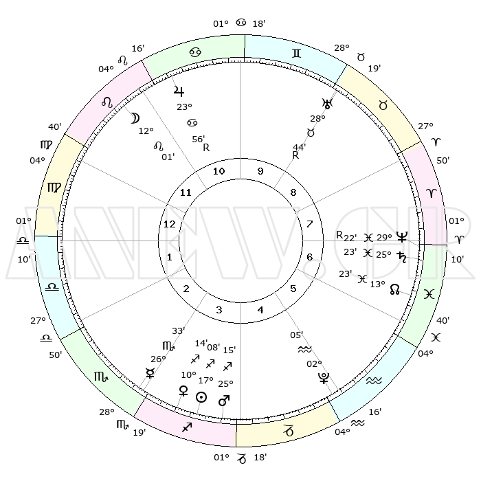 | | ΘΕΣΕΙΣ ΠΛΑΝΗΤΩΝ ΑΣΤΡΟΛΟΓΙΚΟΥ ΧΑΡΤΗ ΤΗΣ ΣΤΙΓΜΗΣ ΑΥΤΗΣ | | | | Πλανήτης | Ζώδιο | Μοίρες | Δεκαήμ. | Σε οίκο | Απόκλιση | | Ακμές των οίκων | | Ηλιος | Τοξότης | 17°05' | Δεύτερο | 3 | 22 S 48 | | 1ος | 18°41' | Παρθένος | | Σελήνη | Λέων | 11°26' | Δεύτερο | 11 | 19 N 54 | | 2ος | 14°21' | Ζυγός | | Ερμής | Σκορπιός | 26°31' | Τρίτο | 3 | 17 S 12 | | 3ος | 14°18' | Σκορπιός | | Αφροδίτη | Τοξότης | 10°11' | Δεύτερο | 3 | 21 S 34 | | 4ος | 17°14' | Τοξότης | | Αρης | Τοξότης | 25°13' | Τρίτο | 4 | 24 S 04 | | 5ος | 20°28' | Αιγόκερως | | Δίας | Καρκίνος | 23°56'R | Τρίτο | 11 | 21 N 29 | | 6ος | 21°20' | Υδροχόος | | Κρόνος | Ιχθείς | 25°23' | Τρίτο | 7 | 03 S 59 | | 7ος | 18°41' | Ιχθείς | | Ουρανός | Ταύρος | 28°44'R | Τρίτο | 9 | 19 N 40 | | 8ος | 14°21' | Κριός | | Ποσειδώνας | Ιχθείς | 29°22'R | Τρίτο | 7 | 01 S 29 | | 9ος | 14°18' | Ταύρος | | Πλούτωνας | Υδροχόος | 02°05' | Πρώτο | 5 | 23 S 21 | | 10ος | 17°14' | Δίδυμοι | | Β. Δεσμός | Ιχθείς | 13°23' | Δεύτερο | 6 | 06 S 32 | | 11ος | 20°28' | Καρκίνος | | Ωροσκόπος | Παρθένος | 18°41' | Δεύτερο | | | 12ος | 21°20' | Λέων | | Μεσουράνημα | Δίδυμοι | 17°14' | Δεύτερο | | | |
