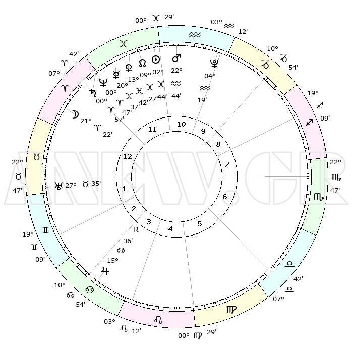 | | ΘΕΣΕΙΣ ΠΛΑΝΗΤΩΝ ΑΣΤΡΟΛΟΓΙΚΟΥ ΧΑΡΤΗ ΤΗΣ ΣΤΙΓΜΗΣ ΑΥΤΗΣ | | | | Πλανήτης | Ζώδιο | Μοίρες | Δεκαήμ. | Σε οίκο | Απόκλιση | | Ακμές των οίκων | | Ηλιος | Ιχθείς | 02°39' | Πρώτο | 12 | 10 S 32 | | 1ος | 14°05' | Κριός | | Σελήνη | Κριός | 20°19' | Τρίτο | 1 | 11 N 11 | | 2ος | 20°43' | Ταύρος | | Ερμής | Ιχθείς | 20°34' | Τρίτο | 12 | 02 S 17 | | 3ος | 16°08' | Δίδυμοι | | Αφροδίτη | Ιχθείς | 13°36' | Δεύτερο | 12 | 07 S 47 | | 4ος | 07°58' | Καρκίνος | | Αρης | Υδροχόος | 22°41' | Τρίτο | 11 | 14 S 59 | | 5ος | 01°03' | Λέων | | Δίας | Καρκίνος | 15°36'R | Δεύτερο | 4 | 22 N 51 | | 6ος | 00°47' | Παρθένος | | Κρόνος | Κριός | 00°56' | Πρώτο | 12 | 01 S 36 | | 7ος | 14°05' | Ζυγός | | Ουρανός | Ταύρος | 27°35' | Τρίτο | 2 | 19 N 26 | | 8ος | 20°43' | Σκορπιός | | Ποσειδώνας | Κριός | 00°47' | Πρώτο | 12 | 00 S 53 | | 9ος | 16°08' | Τοξότης | | Πλούτωνας | Υδροχόος | 04°19' | Πρώτο | 11 | 22 S 55 | | 10ος | 07°58' | Αιγόκερως | | Β. Δεσμός | Ιχθείς | 09°27' | Πρώτο | 12 | 08 S 01 | | 11ος | 01°03' | Υδροχόος | | Ωροσκόπος | Κριός | 14°05' | Δεύτερο | | | 12ος | 00°47' | Ιχθείς | | Μεσουράνημα | Αιγόκερως | 07°58' | Πρώτο | | | |