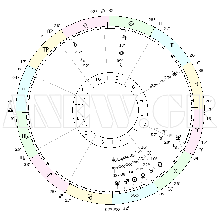 | | ΘΕΣΕΙΣ ΠΛΑΝΗΤΩΝ ΑΣΤΡΟΛΟΓΙΚΟΥ ΧΑΡΤΗ ΤΗΣ ΣΤΙΓΜΗΣ ΑΥΤΗΣ | | | | Πλανήτης | Ζώδιο | Μοίρες | Δεκαήμ. | Σε οίκο | Απόκλιση | | Ακμές των οίκων | | Ηλιος | Υδροχόος | 14°01' | Δεύτερο | 4 | 16 S 37 | | 1ος | 12°40' | Ζυγός | | Σελήνη | Λέων | 26°07' | Τρίτο | 11 | 13 N 55 | | 2ος | 10°05' | Σκορπιός | | Ερμής | Υδροχόος | 22°46' | Τρίτο | 5 | 15 S 35 | | 3ος | 11°01' | Τοξότης | | Αφροδίτη | Υδροχόος | 20°31' | Τρίτο | 5 | 15 S 58 | | 4ος | 14°17' | Αιγόκερως | | Αρης | Υδροχόος | 08°11' | Πρώτο | 4 | 19 S 14 | | 5ος | 17°13' | Υδροχόος | | Δίας | Καρκίνος | 17°09'R | Δεύτερο | 10 | 22 N 38 | | 6ος | 17°06' | Ιχθείς | | Κρόνος | Ιχθείς | 28°56' | Τρίτο | 6 | 02 S 25 | | 7ος | 12°40' | Κριός | | Ουρανός | Ταύρος | 27°27'R | Τρίτο | 8 | 19 N 24 | | 8ος | 10°05' | Ταύρος | | Ποσειδώνας | Κριός | 00°12' | Πρώτο | 6 | 01 S 08 | | 9ος | 11°01' | Δίδυμοι | | Πλούτωνας | Υδροχόος | 03°46' | Πρώτο | 4 | 23 S 01 | | 10ος | 14°17' | Καρκίνος | | Β. Δεσμός | Ιχθείς | 10°26' | Δεύτερο | 5 | 07 S 39 | | 11ος | 17°13' | Λέων | | Ωροσκόπος | Ζυγός | 12°40' | Δεύτερο | | | 12ος | 17°06' | Παρθένος | | Μεσουράνημα | Καρκίνος | 14°17' | Δεύτερο | | | |