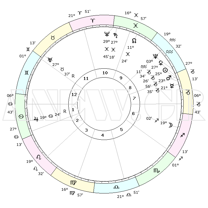 | | ΘΕΣΕΙΣ ΠΛΑΝΗΤΩΝ ΑΣΤΡΟΛΟΓΙΚΟΥ ΧΑΡΤΗ ΤΗΣ ΣΤΙΓΜΗΣ ΑΥΤΗΣ | | | | Πλανήτης | Ζώδιο | Μοίρες | Δεκαήμ. | Σε οίκο | Απόκλιση | | Ακμές των οίκων | | Ηλιος | Αιγόκερως | 25°22' | Τρίτο | 8 | 21 S 04 | | 1ος | 15°08' | Δίδυμοι | | Σελήνη | Τοξότης | 18°17' | Δεύτερο | 7 | 27 S 58 | | 2ος | 07°23' | Καρκίνος | | Ερμής | Αιγόκερως | 21°29' | Τρίτο | 8 | 23 S 31 | | 3ος | 28°37' | Καρκίνος | | Αφροδίτη | Αιγόκερως | 27°29' | Τρίτο | 8 | 21 S 38 | | 4ος | 22°50' | Λέων | | Αρης | Αιγόκερως | 23°54' | Τρίτο | 8 | 22 S 17 | | 5ος | 24°06' | Παρθένος | | Δίας | Καρκίνος | 19°25'R | Δεύτερο | 2 | 22 N 18 | | 6ος | 04°13' | Σκορπιός | | Κρόνος | Ιχθείς | 27°17' | Τρίτο | 11 | 03 S 07 | | 7ος | 15°08' | Τοξότης | | Ουρανός | Ταύρος | 27°37'R | Τρίτο | 12 | 19 N 26 | | 8ος | 07°23' | Αιγόκερως | | Ποσειδώνας | Ιχθείς | 29°45' | Τρίτο | 11 | 01 S 19 | | 9ος | 28°37' | Αιγόκερως | | Πλούτωνας | Υδροχόος | 03°10' | Πρώτο | 9 | 23 S 08 | | 10ος | 22°50' | Υδροχόος | | Β. Δεσμός | Ιχθείς | 11°24' | Δεύτερο | 10 | 07 S 17 | | 11ος | 24°06' | Ιχθείς | | Ωροσκόπος | Δίδυμοι | 15°08' | Δεύτερο | | | 12ος | 04°13' | Ταύρος | | Μεσουράνημα | Υδροχόος | 22°50' | Τρίτο | | | |