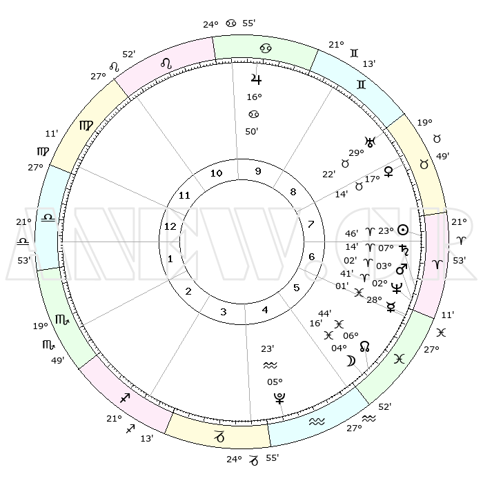 | | ΘΕΣΕΙΣ ΠΛΑΝΗΤΩΝ ΑΣΤΡΟΛΟΓΙΚΟΥ ΧΑΡΤΗ ΤΗΣ ΣΤΙΓΜΗΣ ΑΥΤΗΣ | | | | Πλανήτης | Ζώδιο | Μοίρες | Δεκαήμ. | Σε οίκο | Απόκλιση | | Ακμές των οίκων | | Ηλιος | Κριός | 23°43' | Τρίτο | 7 | 09 N 12 | | 1ος | 02°41' | Ζυγός | | Σελήνη | Ιχθείς | 03°24' | Πρώτο | 5 | 10 S 39 | | 2ος | 29°28' | Ζυγός | | Ερμής | Ιχθείς | 27°56' | Τρίτο | 6 | 03 S 09 | | 3ος | 29°60' | Σκορπιός | | Αφροδίτη | Ταύρος | 17°09' | Δεύτερο | 8 | 17 N 03 | | 4ος | 03°01' | Αιγόκερως | | Αρης | Κριός | 02°59' | Πρώτο | 7 | 00 N 17 | | 5ος | 05°58' | Υδροχόος | | Δίας | Καρκίνος | 16°50' | Δεύτερο | 10 | 22 N 45 | | 6ος | 06°18' | Ιχθείς | | Κρόνος | Κριός | 07°13' | Πρώτο | 7 | 00 N 54 | | 7ος | 02°41' | Κριός | | Ουρανός | Ταύρος | 29°21' | Τρίτο | 8 | 19 N 51 | | 8ος | 29°28' | Κριός | | Ποσειδώνας | Κριός | 02°41' | Πρώτο | 6 | 00 S 08 | | 9ος | 29°60' | Ταύρος | | Πλούτωνας | Υδροχόος | 05°23' | Πρώτο | 4 | 22 S 47 | | 10ος | 03°01' | Καρκίνος | | Β. Δεσμός | Ιχθείς | 06°44' | Πρώτο | 6 | 09 S 02 | | 11ος | 05°58' | Λέων | | Ωροσκόπος | Ζυγός | 02°41' | Πρώτο | | | 12ος | 06°18' | Παρθένος | | Μεσουράνημα | Καρκίνος | 03°01' | Πρώτο | | | |
