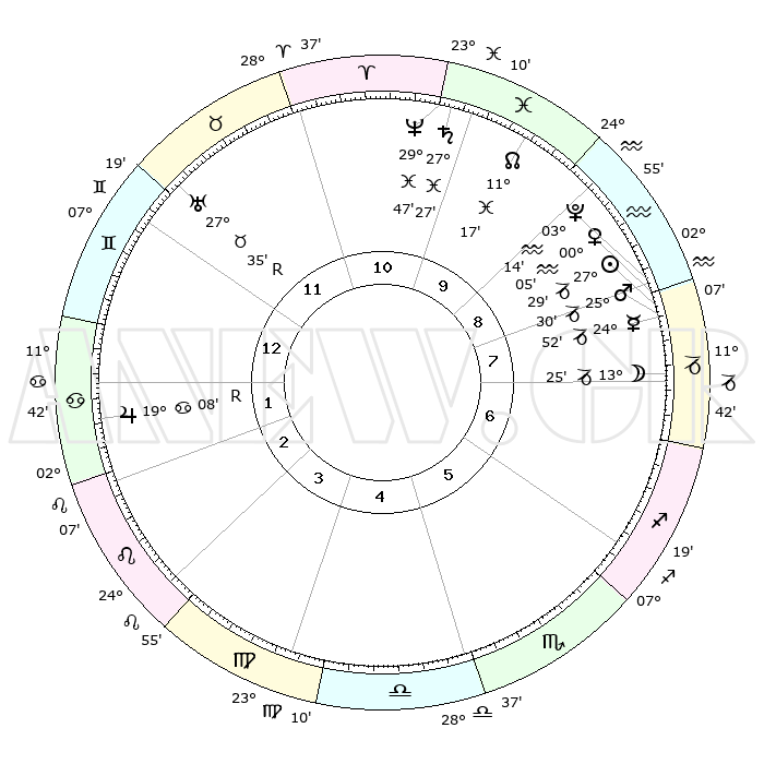 | | ΘΕΣΕΙΣ ΠΛΑΝΗΤΩΝ ΑΣΤΡΟΛΟΓΙΚΟΥ ΧΑΡΤΗ ΤΗΣ ΣΤΙΓΜΗΣ ΑΥΤΗΣ | | | | Πλανήτης | Ζώδιο | Μοίρες | Δεκαήμ. | Σε οίκο | Απόκλιση | | Ακμές των οίκων | | Ηλιος | Αιγόκερως | 27°24' | Τρίτο | 8 | 20 S 40 | | 1ος | 17°40' | Δίδυμοι | | Σελήνη | Αιγόκερως | 12°32' | Δεύτερο | 8 | 27 S 09 | | 2ος | 09°35' | Καρκίνος | | Ερμής | Αιγόκερως | 24°45' | Τρίτο | 8 | 23 S 03 | | 3ος | 00°51' | Λέων | | Αφροδίτη | Αιγόκερως | 29°60' | Τρίτο | 8 | 21 S 10 | | 4ος | 25°23' | Λέων | | Αρης | Αιγόκερως | 25°27' | Τρίτο | 8 | 22 S 01 | | 5ος | 27°07' | Παρθένος | | Δίας | Καρκίνος | 19°09'R | Δεύτερο | 2 | 22 N 20 | | 6ος | 07°22' | Σκορπιός | | Κρόνος | Ιχθείς | 27°27' | Τρίτο | 11 | 03 S 03 | | 7ος | 17°40' | Τοξότης | | Ουρανός | Ταύρος | 27°35'R | Τρίτο | 12 | 19 N 26 | | 8ος | 09°35' | Αιγόκερως | | Ποσειδώνας | Ιχθείς | 29°47' | Τρίτο | 11 | 01 S 18 | | 9ος | 00°51' | Υδροχόος | | Πλούτωνας | Υδροχόος | 03°14' | Πρώτο | 9 | 23 S 07 | | 10ος | 25°23' | Υδροχόος | | Β. Δεσμός | Ιχθείς | 11°18' | Δεύτερο | 10 | 07 S 20 | | 11ος | 27°07' | Ιχθείς | | Ωροσκόπος | Δίδυμοι | 17°40' | Δεύτερο | | | 12ος | 07°22' | Ταύρος | | Μεσουράνημα | Υδροχόος | 25°23' | Τρίτο | | | |