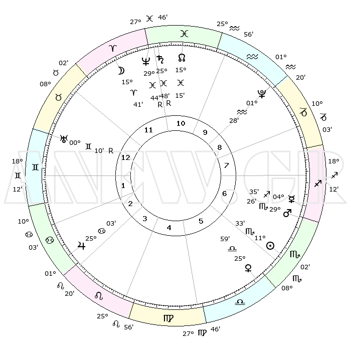 | | ΘΕΣΕΙΣ ΠΛΑΝΗΤΩΝ ΑΣΤΡΟΛΟΓΙΚΟΥ ΧΑΡΤΗ ΤΗΣ ΣΤΙΓΜΗΣ ΑΥΤΗΣ | | | | Πλανήτης | Ζώδιο | Μοίρες | Δεκαήμ. | Σε οίκο | Απόκλιση | | Ακμές των οίκων | | Ηλιος | Σκορπιός | 11°15' | Δεύτερο | 9 | 15 S 12 | | 1ος | 22°23' | Αιγόκερως | | Σελήνη | Κριός | 11°20' | Δεύτερο | 2 | 06 N 25 | | 2ος | 05°02' | Ιχθείς | | Ερμής | Τοξότης | 04°22' | Πρώτο | 10 | 23 S 50 | | 3ος | 14°31' | Κριός | | Αφροδίτη | Ζυγός | 25°37' | Τρίτο | 9 | 08 S 33 | | 4ος | 14°21' | Ταύρος | | Αρης | Σκορπιός | 29°13' | Τρίτο | 10 | 20 S 23 | | 5ος | 07°46' | Δίδυμοι | | Δίας | Καρκίνος | 25°02' | Τρίτο | 7 | 21 N 12 | | 6ος | 28°60' | Δίδυμοι | | Κρόνος | Ιχθείς | 25°49'R | Τρίτο | 2 | 03 S 55 | | 7ος | 22°23' | Καρκίνος | | Ουρανός | Δίδυμοι | 00°11'R | Πρώτο | 4 | 19 N 59 | | 8ος | 05°02' | Παρθένος | | Ποσειδώνας | Ιχθείς | 29°44'R | Τρίτο | 2 | 01 S 21 | | 9ος | 14°31' | Ζυγός | | Πλούτωνας | Υδροχόος | 01°28' | Πρώτο | 1 | 23 S 30 | | 10ος | 14°21' | Σκορπιός | | Β. Δεσμός | Ιχθείς | 15°16' | Δεύτερο | 2 | 05 S 48 | | 11ος | 07°46' | Τοξότης | | Ωροσκόπος | Αιγόκερως | 22°23' | Τρίτο | | | 12ος | 28°60' | Τοξότης | | Μεσουράνημα | Σκορπιός | 14°21' | Δεύτερο | | | |
