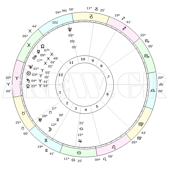 | | ΘΕΣΕΙΣ ΠΛΑΝΗΤΩΝ ΑΣΤΡΟΛΟΓΙΚΟΥ ΧΑΡΤΗ ΤΗΣ ΣΤΙΓΜΗΣ ΑΥΤΗΣ | | | | Πλανήτης | Ζώδιο | Μοίρες | Δεκαήμ. | Σε οίκο | Απόκλιση | | Ακμές των οίκων | | Ηλιος | Κριός | 03°31' | Πρώτο | 1 | 01 N 24 | | 1ος | 13°57' | Ιχθείς | | Σελήνη | Δίδυμοι | 11°37' | Δεύτερο | 3 | 27 N 21 | | 2ος | 27°36' | Κριός | | Ερμής | Ιχθείς | 09°01' | Πρώτο | 12 | 08 S 00 | | 3ος | 27°41' | Ταύρος | | Αφροδίτη | Κριός | 21°58' | Τρίτο | 1 | 07 N 52 | | 4ος | 20°54' | Δίδυμοι | | Αρης | Ιχθείς | 16°59' | Δεύτερο | 1 | 06 S 08 | | 5ος | 12°42' | Καρκίνος | | Δίας | Καρκίνος | 15°22' | Δεύτερο | 5 | 22 N 55 | | 6ος | 07°51' | Λέων | | Κρόνος | Κριός | 04°41' | Πρώτο | 1 | 00 S 05 | | 7ος | 13°57' | Παρθένος | | Ουρανός | Ταύρος | 28°26' | Τρίτο | 3 | 19 N 38 | | 8ος | 27°36' | Ζυγός | | Ποσειδώνας | Κριός | 01°55' | Πρώτο | 1 | 00 S 26 | | 9ος | 27°41' | Σκορπιός | | Πλούτωνας | Υδροχόος | 05°05' | Πρώτο | 11 | 22 S 48 | | 10ος | 20°54' | Τοξότης | | Β. Δεσμός | Ιχθείς | 07°49' | Πρώτο | 12 | 08 S 38 | | 11ος | 12°42' | Αιγόκερως | | Ωροσκόπος | Ιχθείς | 13°57' | Δεύτερο | | | 12ος | 07°51' | Υδροχόος | | Μεσουράνημα | Τοξότης | 20°54' | Τρίτο | | | |