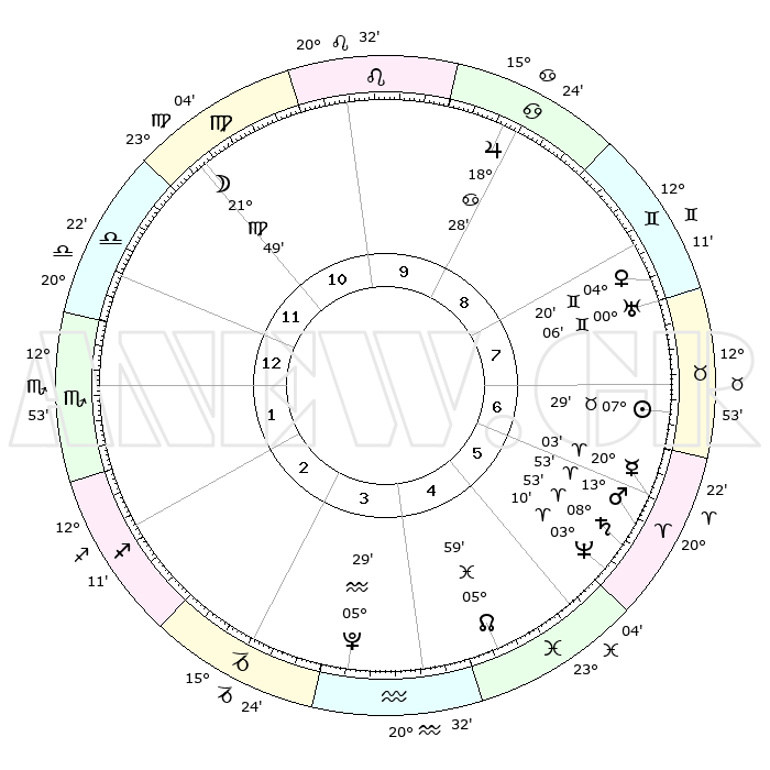| | ΘΕΣΕΙΣ ΠΛΑΝΗΤΩΝ ΑΣΤΡΟΛΟΓΙΚΟΥ ΧΑΡΤΗ ΤΗΣ ΣΤΙΓΜΗΣ ΑΥΤΗΣ | | | | Πλανήτης | Ζώδιο | Μοίρες | Δεκαήμ. | Σε οίκο | Απόκλιση | | Ακμές των οίκων | | Ηλιος | Ταύρος | 07°25' | Πρώτο | 7 | 13 N 59 | | 1ος | 24°44' | Ζυγός | | Σελήνη | Παρθένος | 21°01' | Τρίτο | 11 | 02 N 27 | | 2ος | 22°50' | Σκορπιός | | Ερμής | Κριός | 19°56' | Δεύτερο | 6 | 05 N 43 | | 3ος | 24°25' | Τοξότης | | Αφροδίτη | Δίδυμοι | 04°16' | Πρώτο | 8 | 21 N 44 | | 4ος | 28°16' | Αιγόκερως | | Αρης | Κριός | 13°50' | Δεύτερο | 6 | 04 N 37 | | 5ος | 01°13' | Ιχθείς | | Δίας | Καρκίνος | 18°28' | Δεύτερο | 9 | 22 N 33 | | 6ος | 00°20' | Κριός | | Κρόνος | Κριός | 08°53' | Πρώτο | 6 | 01 N 32 | | 7ος | 24°44' | Κριός | | Ουρανός | Δίδυμοι | 00°06' | Πρώτο | 8 | 20 N 00 | | 8ος | 22°50' | Ταύρος | | Ποσειδώνας | Κριός | 03°09' | Πρώτο | 6 | 00 N 03 | | 9ος | 24°25' | Δίδυμοι | | Πλούτωνας | Υδροχόος | 05°29' | Πρώτο | 4 | 22 S 48 | | 10ος | 28°16' | Καρκίνος | | Β. Δεσμός | Ιχθείς | 05°59' | Πρώτο | 5 | 09 S 19 | | 11ος | 01°13' | Παρθένος | | Ωροσκόπος | Ζυγός | 24°44' | Τρίτο | | | 12ος | 00°20' | Ζυγός | | Μεσουράνημα | Καρκίνος | 28°16' | Τρίτο | | | |