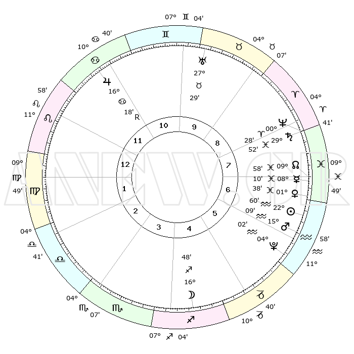 | | ΘΕΣΕΙΣ ΠΛΑΝΗΤΩΝ ΑΣΤΡΟΛΟΓΙΚΟΥ ΧΑΡΤΗ ΤΗΣ ΣΤΙΓΜΗΣ ΑΥΤΗΣ | | | | Πλανήτης | Ζώδιο | Μοίρες | Δεκαήμ. | Σε οίκο | Απόκλιση | | Ακμές των οίκων | | Ηλιος | Υδροχόος | 22°51' | Τρίτο | 8 | 13 S 54 | | 1ος | 00°04' | Λέων | | Σελήνη | Τοξότης | 15°11' | Δεύτερο | 5 | 27 S 48 | | 2ος | 21°06' | Λέων | | Ερμής | Ιχθείς | 07°57' | Πρώτο | 8 | 09 S 11 | | 3ος | 16°10' | Παρθένος | | Αφροδίτη | Ιχθείς | 01°27' | Πρώτο | 8 | 12 S 19 | | 4ος | 17°12' | Ζυγός | | Αρης | Υδροχόος | 15°02' | Δεύτερο | 7 | 17 S 21 | | 5ος | 23°15' | Σκορπιός | | Δίας | Καρκίνος | 16°18'R | Δεύτερο | 12 | 22 N 45 | | 6ος | 28°57' | Τοξότης | | Κρόνος | Ιχθείς | 29°51' | Τρίτο | 9 | 02 S 02 | | 7ος | 00°04' | Υδροχόος | | Ουρανός | Ταύρος | 27°29' | Τρίτο | 11 | 19 N 25 | | 8ος | 21°06' | Υδροχόος | | Ποσειδώνας | Κριός | 00°27' | Πρώτο | 9 | 01 S 01 | | 9ος | 16°10' | Ιχθείς | | Πλούτωνας | Υδροχόος | 04°02' | Πρώτο | 7 | 22 S 58 | | 10ος | 17°12' | Κριός | | Β. Δεσμός | Ιχθείς | 09°58' | Πρώτο | 8 | 07 S 50 | | 11ος | 23°15' | Ταύρος | | Ωροσκόπος | Λέων | 00°04' | Πρώτο | | | 12ος | 28°57' | Δίδυμοι | | Μεσουράνημα | Κριός | 17°12' | Δεύτερο | | | |