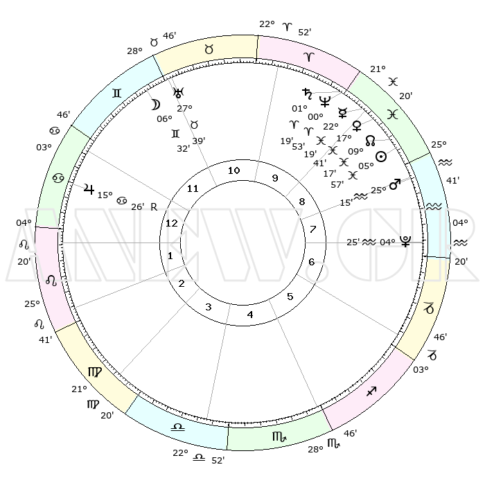 | | ΘΕΣΕΙΣ ΠΛΑΝΗΤΩΝ ΑΣΤΡΟΛΟΓΙΚΟΥ ΧΑΡΤΗ ΤΗΣ ΣΤΙΓΜΗΣ ΑΥΤΗΣ | | | | Πλανήτης | Ζώδιο | Μοίρες | Δεκαήμ. | Σε οίκο | Απόκλιση | | Ακμές των οίκων | | Ηλιος | Ιχθείς | 05°53' | Πρώτο | 9 | 09 S 21 | | 1ος | 13°17' | Καρκίνος | | Σελήνη | Δίδυμοι | 05°32' | Πρώτο | 11 | 26 N 24 | | 2ος | 03°42' | Λέων | | Ερμής | Ιχθείς | 22°18' | Τρίτο | 9 | 00 S 52 | | 3ος | 26°40' | Λέων | | Αφροδίτη | Ιχθείς | 17°36' | Δεύτερο | 9 | 06 S 12 | | 4ος | 25°11' | Παρθένος | | Αρης | Υδροχόος | 25°12' | Τρίτο | 8 | 14 S 09 | | 5ος | 00°46' | Σκορπιός | | Δίας | Καρκίνος | 15°26'R | Δεύτερο | 1 | 22 N 53 | | 6ος | 09°15' | Τοξότης | | Κρόνος | Κριός | 01°18' | Πρώτο | 10 | 01 S 26 | | 7ος | 13°17' | Αιγόκερως | | Ουρανός | Ταύρος | 27°39' | Τρίτο | 11 | 19 N 27 | | 8ος | 03°42' | Υδροχόος | | Ποσειδώνας | Κριός | 00°53' | Πρώτο | 10 | 00 S 51 | | 9ος | 26°40' | Υδροχόος | | Πλούτωνας | Υδροχόος | 04°25' | Πρώτο | 8 | 22 S 54 | | 10ος | 25°11' | Ιχθείς | | Β. Δεσμός | Ιχθείς | 09°17' | Πρώτο | 9 | 08 S 05 | | 11ος | 00°46' | Ταύρος | | Ωροσκόπος | Καρκίνος | 13°17' | Δεύτερο | | | 12ος | 09°15' | Δίδυμοι | | Μεσουράνημα | Ιχθείς | 25°11' | Τρίτο | | | |