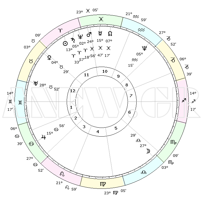 | | ΘΕΣΕΙΣ ΠΛΑΝΗΤΩΝ ΑΣΤΡΟΛΟΓΙΚΟΥ ΧΑΡΤΗ ΤΗΣ ΣΤΙΓΜΗΣ ΑΥΤΗΣ | | | | Πλανήτης | Ζώδιο | Μοίρες | Δεκαήμ. | Σε οίκο | Απόκλιση | | Ακμές των οίκων | | Ηλιος | Κριός | 13°29' | Δεύτερο | 12 | 05 N 19 | | 1ος | 11°17' | Ταύρος | | Σελήνη | Ζυγός | 26°32' | Τρίτο | 6 | 13 S 49 | | 2ος | 10°28' | Δίδυμοι | | Ερμής | Ιχθείς | 15°43' | Δεύτερο | 11 | 07 S 08 | | 3ος | 02°59' | Καρκίνος | | Αφροδίτη | Ταύρος | 04°23' | Πρώτο | 12 | 12 N 39 | | 4ος | 24°51' | Καρκίνος | | Αρης | Ιχθείς | 24°52' | Τρίτο | 11 | 02 S 59 | | 5ος | 20°30' | Λέων | | Δίας | Καρκίνος | 15°56' | Δεύτερο | 3 | 22 N 51 | | 6ος | 25°29' | Παρθένος | | Κρόνος | Κριός | 05°56' | Πρώτο | 12 | 00 N 24 | | 7ος | 11°17' | Σκορπιός | | Ουρανός | Ταύρος | 28°52' | Τρίτο | 1 | 19 N 44 | | 8ος | 10°28' | Τοξότης | | Ποσειδώνας | Κριός | 02°18' | Πρώτο | 12 | 00 S 17 | | 9ος | 02°59' | Αιγόκερως | | Πλούτωνας | Υδροχόος | 05°15' | Πρώτο | 10 | 22 S 47 | | 10ος | 24°51' | Αιγόκερως | | Β. Δεσμός | Ιχθείς | 07°17' | Πρώτο | 11 | 08 S 50 | | 11ος | 20°30' | Υδροχόος | | Ωροσκόπος | Ταύρος | 11°17' | Δεύτερο | | | 12ος | 25°29' | Ιχθείς | | Μεσουράνημα | Αιγόκερως | 24°51' | Τρίτο | | | |