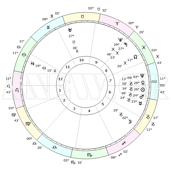 | | ΘΕΣΕΙΣ ΠΛΑΝΗΤΩΝ ΑΣΤΡΟΛΟΓΙΚΟΥ ΧΑΡΤΗ ΤΗΣ ΣΤΙΓΜΗΣ ΑΥΤΗΣ | | | | Πλανήτης | Ζώδιο | Μοίρες | Δεκαήμ. | Σε οίκο | Απόκλιση | | Ακμές των οίκων | | Ηλιος | Αιγόκερως | 26°29' | Τρίτο | 7 | 20 S 51 | | 1ος | 18°17' | Καρκίνος | | Σελήνη | Αιγόκερως | 01°30' | Πρώτο | 6 | 28 S 12 | | 2ος | 08°47' | Λέων | | Ερμής | Αιγόκερως | 23°16' | Τρίτο | 7 | 23 S 16 | | 3ος | 02°18' | Παρθένος | | Αφροδίτη | Αιγόκερως | 28°52' | Τρίτο | 7 | 21 S 23 | | 4ος | 01°39' | Ζυγός | | Αρης | Αιγόκερως | 24°45' | Τρίτο | 7 | 22 S 08 | | 5ος | 07°34' | Σκορπιός | | Δίας | Καρκίνος | 19°16'R | Δεύτερο | 1 | 22 N 19 | | 6ος | 15°15' | Τοξότης | | Κρόνος | Ιχθείς | 27°22' | Τρίτο | 9 | 03 S 04 | | 7ος | 18°17' | Αιγόκερως | | Ουρανός | Ταύρος | 27°36'R | Τρίτο | 11 | 19 N 26 | | 8ος | 08°47' | Υδροχόος | | Ποσειδώνας | Ιχθείς | 29°46' | Τρίτο | 9 | 01 S 18 | | 9ος | 02°18' | Ιχθείς | | Πλούτωνας | Υδροχόος | 03°13' | Πρώτο | 7 | 23 S 07 | | 10ος | 01°39' | Κριός | | Β. Δεσμός | Ιχθείς | 11°21' | Δεύτερο | 9 | 07 S 19 | | 11ος | 07°34' | Ταύρος | | Ωροσκόπος | Καρκίνος | 18°17' | Δεύτερο | | | 12ος | 15°15' | Δίδυμοι | | Μεσουράνημα | Κριός | 01°39' | Πρώτο | | | |