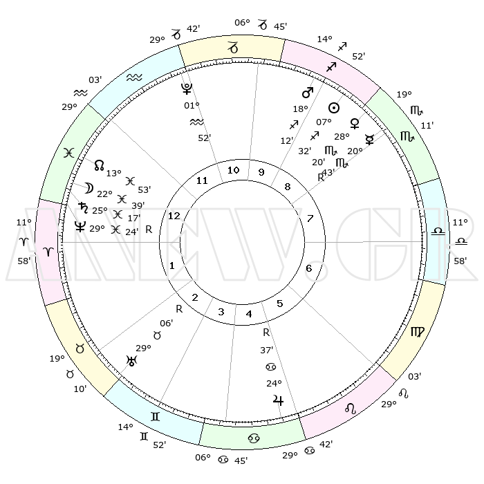 | | ΘΕΣΕΙΣ ΠΛΑΝΗΤΩΝ ΑΣΤΡΟΛΟΓΙΚΟΥ ΧΑΡΤΗ ΤΗΣ ΣΤΙΓΜΗΣ ΑΥΤΗΣ | | | | Πλανήτης | Ζώδιο | Μοίρες | Δεκαήμ. | Σε οίκο | Απόκλιση | | Ακμές των οίκων | | Ηλιος | Τοξότης | 07°30' | Πρώτο | 9 | 21 S 33 | | 1ος | 24°49' | Ιχθείς | | Σελήνη | Ιχθείς | 22°15' | Τρίτο | 12 | 02 S 26 | | 2ος | 06°19' | Ταύρος | | Ερμής | Σκορπιός | 20°43'R | Τρίτο | 8 | 15 S 29 | | 3ος | 04°32' | Δίδυμοι | | Αφροδίτη | Σκορπιός | 28°18' | Τρίτο | 8 | 19 S 02 | | 4ος | 27°05' | Δίδυμοι | | Αρης | Τοξότης | 18°11' | Δεύτερο | 9 | 23 S 33 | | 5ος | 19°11' | Καρκίνος | | Δίας | Καρκίνος | 24°37'R | Τρίτο | 5 | 21 N 21 | | 6ος | 15°49' | Λέων | | Κρόνος | Ιχθείς | 25°17' | Τρίτο | 1 | 04 S 03 | | 7ος | 24°49' | Παρθένος | | Ουρανός | Ταύρος | 29°06'R | Τρίτο | 2 | 19 N 45 | | 8ος | 06°19' | Σκορπιός | | Ποσειδώνας | Ιχθείς | 29°24'R | Τρίτο | 1 | 01 S 29 | | 9ος | 04°32' | Τοξότης | | Πλούτωνας | Υδροχόος | 01°52' | Πρώτο | 11 | 23 S 24 | | 10ος | 27°05' | Τοξότης | | Β. Δεσμός | Ιχθείς | 13°53' | Δεύτερο | 12 | 06 S 20 | | 11ος | 19°11' | Αιγόκερως | | Ωροσκόπος | Ιχθείς | 24°49' | Τρίτο | | | 12ος | 15°49' | Υδροχόος | | Μεσουράνημα | Τοξότης | 27°05' | Τρίτο | | | |