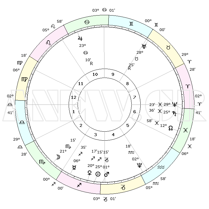 | | ΘΕΣΕΙΣ ΠΛΑΝΗΤΩΝ ΑΣΤΡΟΛΟΓΙΚΟΥ ΧΑΡΤΗ ΤΗΣ ΣΤΙΓΜΗΣ ΑΥΤΗΣ | | | | Πλανήτης | Ζώδιο | Μοίρες | Δεκαήμ. | Σε οίκο | Απόκλιση | | Ακμές των οίκων | | Ηλιος | Τοξότης | 24°56' | Τρίτο | 6 | 23 S 20 | | 1ος | 29°31' | Δίδυμοι | | Σελήνη | Σκορπιός | 17°32' | Δεύτερο | 5 | 21 S 24 | | 2ος | 20°20' | Καρκίνος | | Ερμής | Τοξότης | 06°09' | Πρώτο | 6 | 20 S 01 | | 3ος | 12°06' | Λέων | | Αφροδίτη | Τοξότης | 19°53' | Δεύτερο | 6 | 22 S 57 | | 4ος | 08°21' | Παρθένος | | Αρης | Αιγόκερως | 01°01' | Πρώτο | 7 | 24 S 13 | | 5ος | 12°12' | Ζυγός | | Δίας | Καρκίνος | 23°12'R | Τρίτο | 2 | 21 N 38 | | 6ος | 22°14' | Σκορπιός | | Κρόνος | Ιχθείς | 25°35' | Τρίτο | 10 | 03 S 53 | | 7ος | 29°31' | Τοξότης | | Ουρανός | Ταύρος | 28°26'R | Τρίτο | 12 | 19 N 37 | | 8ος | 20°20' | Αιγόκερως | | Ποσειδώνας | Ιχθείς | 29°23' | Τρίτο | 10 | 01 S 29 | | 9ος | 12°06' | Υδροχόος | | Πλούτωνας | Υδροχόος | 02°17' | Πρώτο | 8 | 23 S 19 | | 10ος | 08°21' | Ιχθείς | | Β. Δεσμός | Ιχθείς | 12°59' | Δεύτερο | 10 | 06 S 41 | | 11ος | 12°12' | Κριός | | Ωροσκόπος | Δίδυμοι | 29°31' | Τρίτο | | | 12ος | 22°14' | Ταύρος | | Μεσουράνημα | Ιχθείς | 08°21' | Πρώτο | | | |