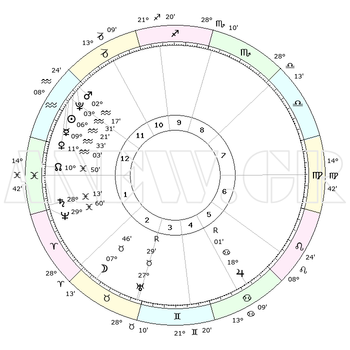 | | ΘΕΣΕΙΣ ΠΛΑΝΗΤΩΝ ΑΣΤΡΟΛΟΓΙΚΟΥ ΧΑΡΤΗ ΤΗΣ ΣΤΙΓΜΗΣ ΑΥΤΗΣ | | | | Πλανήτης | Ζώδιο | Μοίρες | Δεκαήμ. | Σε οίκο | Απόκλιση | | Ακμές των οίκων | | Ηλιος | Υδροχόος | 06°17' | Πρώτο | 12 | 18 S 42 | | 1ος | 08°09' | Υδροχόος | | Σελήνη | Ταύρος | 06°47' | Πρώτο | 3 | 17 N 55 | | 2ος | 23°21' | Ιχθείς | | Ερμής | Υδροχόος | 09°25' | Πρώτο | 1 | 19 S 54 | | 3ος | 00°23' | Ταύρος | | Αφροδίτη | Υδροχόος | 10°57' | Δεύτερο | 1 | 18 S 41 | | 4ος | 27°31' | Ταύρος | | Αρης | Υδροχόος | 02°14' | Πρώτο | 12 | 20 S 39 | | 5ος | 19°47' | Δίδυμοι | | Δίας | Καρκίνος | 18°02'R | Δεύτερο | 6 | 22 N 31 | | 6ος | 11°34' | Καρκίνος | | Κρόνος | Ιχθείς | 28°12' | Τρίτο | 2 | 02 S 43 | | 7ος | 08°09' | Λέων | | Ουρανός | Ταύρος | 27°29'R | Τρίτο | 3 | 19 N 25 | | 8ος | 23°21' | Παρθένος | | Ποσειδώνας | Ιχθείς | 29°59' | Τρίτο | 2 | 01 S 13 | | 9ος | 00°23' | Σκορπιός | | Πλούτωνας | Υδροχόος | 03°31' | Πρώτο | 12 | 23 S 03 | | 10ος | 27°31' | Σκορπιός | | Β. Δεσμός | Ιχθείς | 10°50' | Δεύτερο | 1 | 07 S 30 | | 11ος | 19°47' | Τοξότης | | Ωροσκόπος | Υδροχόος | 08°09' | Πρώτο | | | 12ος | 11°34' | Αιγόκερως | | Μεσουράνημα | Σκορπιός | 27°31' | Τρίτο | | | |