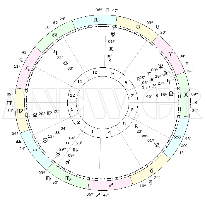 | ΘΕΣΕΙΣ ΠΛΑΝΗΤΩΝ ΑΣΤΡΟΛΟΓΙΚΟΥ ΧΑΡΤΗ ΤΗΣ ΣΤΙΓΜΗΣ ΑΥΤΗΣ | | Πλανήτης | Ζώδιο | Μοίρες | Δεκαήμ. | Σε οίκο | Απόκλιση | | Ακμές των οίκων | Ηλιος | Ζυγός | 12°59' | Δεύτερο | 3 | 05 S 08 | | 1ος | 14°08' | Λέων | Σελήνη | Ιχθείς | 26°51' | Τρίτο | 8 | 00 S 32 | | 2ος | 06°21' | Παρθένος | Ερμής | Ζυγός | 28°56' | Τρίτο | 3 | 11 S 45 | | 3ος | 03°17' | Ζυγός | Αφροδίτη | Παρθένος | 20°14' | Τρίτο | 2 | 05 N 09 | | 4ος | 05°39' | Σκορπιός | Αρης | Σκορπιός | 09°17' | Πρώτο | 4 | 14 S 42 | | 5ος | 10°60' | Τοξότης | Δίας | Καρκίνος | 23°03' | Τρίτο | 12 | 21 N 30 | | 6ος | 14°35' | Αιγόκερως | Κρόνος | Ιχθείς | 27°31'R | Τρίτο | 8 | 03 S 17 | | 7ος | 14°08' | Υδροχόος | Ουρανός | Δίδυμοι | 01°06'R | Πρώτο | 10 | 20 N 10 | | 8ος | 06°21' | Ιχθείς | Ποσειδώνας | Κριός | 00°25'R | Πρώτο | 8 | 01 S 06 | | 9ος | 03°17' | Κριός | Πλούτωνας | Υδροχόος | 01°23'R | Πρώτο | 6 | 23 S 32 | | 10ος | 05°39' | Ταύρος | Β. Δεσμός | Ιχθείς | 16°47' | Δεύτερο | 8 | 05 S 13 | | 11ος | 10°60' | Δίδυμοι | Ωροσκόπος | Λέων | 14°08' | Δεύτερο | | | 12ος | 14°35' | Καρκίνος | Μεσουράνημα | Ταύρος | 05°39' | Πρώτο | | | |