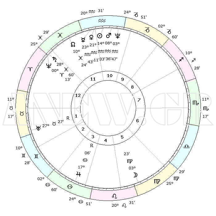 | | ΘΕΣΕΙΣ ΠΛΑΝΗΤΩΝ ΑΣΤΡΟΛΟΓΙΚΟΥ ΧΑΡΤΗ ΤΗΣ ΣΤΙΓΜΗΣ ΑΥΤΗΣ | | | | Πλανήτης | Ζώδιο | Μοίρες | Δεκαήμ. | Σε οίκο | Απόκλιση | | Ακμές των οίκων | | Ηλιος | Υδροχόος | 14°29' | Δεύτερο | 11 | 16 S 29 | | 1ος | 08°55' | Κριός | | Σελήνη | Παρθένος | 02°35' | Πρώτο | 6 | 11 N 06 | | 2ος | 16°57' | Ταύρος | | Ερμής | Υδροχόος | 23°37' | Τρίτο | 11 | 15 S 16 | | 3ος | 13°03' | Δίδυμοι | | Αφροδίτη | Υδροχόος | 21°06' | Τρίτο | 11 | 15 S 47 | | 4ος | 05°01' | Καρκίνος | | Αρης | Υδροχόος | 08°34' | Πρώτο | 11 | 19 S 08 | | 5ος | 27°47' | Καρκίνος | | Δίας | Καρκίνος | 17°06'R | Δεύτερο | 4 | 22 N 39 | | 6ος | 26°37' | Λέων | | Κρόνος | Ιχθείς | 28°59' | Τρίτο | 12 | 02 S 24 | | 7ος | 08°55' | Ζυγός | | Ουρανός | Ταύρος | 27°27'R | Τρίτο | 2 | 19 N 24 | | 8ος | 16°57' | Σκορπιός | | Ποσειδώνας | Κριός | 00°13' | Πρώτο | 12 | 01 S 07 | | 9ος | 13°03' | Τοξότης | | Πλούτωνας | Υδροχόος | 03°46' | Πρώτο | 11 | 23 S 00 | | 10ος | 05°01' | Αιγόκερως | | Β. Δεσμός | Ιχθείς | 10°24' | Δεύτερο | 12 | 07 S 40 | | 11ος | 27°47' | Αιγόκερως | | Ωροσκόπος | Κριός | 08°55' | Πρώτο | | | 12ος | 26°37' | Υδροχόος | | Μεσουράνημα | Αιγόκερως | 05°01' | Πρώτο | | | |