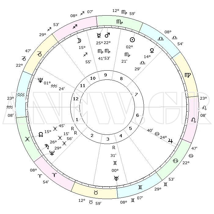 | | ΘΕΣΕΙΣ ΠΛΑΝΗΤΩΝ ΑΣΤΡΟΛΟΓΙΚΟΥ ΧΑΡΤΗ ΤΗΣ ΣΤΙΓΜΗΣ ΑΥΤΗΣ | | | | Πλανήτης | Ζώδιο | Μοίρες | Δεκαήμ. | Σε οίκο | Απόκλιση | | Ακμές των οίκων | | Ηλιος | Σκορπιός | 01°54' | Πρώτο | 2 | 12 S 08 | | 1ος | 24°50' | Παρθένος | | Σελήνη | Τοξότης | 10°34' | Δεύτερο | 3 | 27 S 04 | | 2ος | 21°01' | Ζυγός | | Ερμής | Σκορπιός | 25°09' | Τρίτο | 3 | 21 S 36 | | 3ος | 21°15' | Σκορπιός | | Αφροδίτη | Ζυγός | 13°56' | Δεύτερο | 1 | 04 S 05 | | 4ος | 24°11' | Τοξότης | | Αρης | Σκορπιός | 22°34' | Τρίτο | 3 | 18 S 43 | | 5ος | 27°15' | Αιγόκερως | | Δίας | Καρκίνος | 24°39' | Τρίτο | 10 | 21 N 15 | | 6ος | 27°53' | Υδροχόος | | Κρόνος | Ιχθείς | 26°16'R | Τρίτο | 7 | 03 S 46 | | 7ος | 24°50' | Ιχθείς | | Ουρανός | Δίδυμοι | 00°32'R | Πρώτο | 9 | 20 N 03 | | 8ος | 21°01' | Κριός | | Ποσειδώνας | Ιχθείς | 29°56'R | Τρίτο | 7 | 01 S 17 | | 9ος | 21°15' | Ταύρος | | Πλούτωνας | Υδροχόος | 01°24' | Πρώτο | 5 | 23 S 32 | | 10ος | 24°11' | Δίδυμοι | | Β. Δεσμός | Ιχθείς | 15°46' | Δεύτερο | 6 | 05 S 37 | | 11ος | 27°15' | Καρκίνος | | Ωροσκόπος | Παρθένος | 24°50' | Τρίτο | | | 12ος | 27°53' | Λέων | | Μεσουράνημα | Δίδυμοι | 24°11' | Τρίτο | | | |