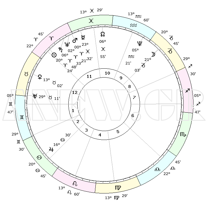 | | ΘΕΣΕΙΣ ΠΛΑΝΗΤΩΝ ΑΣΤΡΟΛΟΓΙΚΟΥ ΧΑΡΤΗ ΤΗΣ ΣΤΙΓΜΗΣ ΑΥΤΗΣ | | | | Πλανήτης | Ζώδιο | Μοίρες | Δεκαήμ. | Σε οίκο | Απόκλιση | | Ακμές των οίκων | | Ηλιος | Κριός | 20°19' | Τρίτο | 12 | 07 N 56 | | 1ος | 24°14' | Κριός | | Σελήνη | Αιγόκερως | 20°00' | Τρίτο | 10 | 25 S 45 | | 2ος | 28°03' | Ταύρος | | Ερμής | Ιχθείς | 23°25' | Τρίτο | 12 | 04 S 46 | | 3ος | 22°14' | Δίδυμοι | | Αφροδίτη | Ταύρος | 12°55' | Δεύτερο | 1 | 15 N 40 | | 4ος | 13°56' | Καρκίνος | | Αρης | Κριός | 00°17' | Πρώτο | 12 | 00 S 49 | | 5ος | 07°48' | Λέων | | Δίας | Καρκίνος | 16°30' | Δεύτερο | 4 | 22 N 47 | | 6ος | 09°23' | Παρθένος | | Κρόνος | Κριός | 06°48' | Πρώτο | 12 | 00 N 44 | | 7ος | 24°14' | Ζυγός | | Ουρανός | Ταύρος | 29°11' | Τρίτο | 2 | 19 N 48 | | 8ος | 28°03' | Σκορπιός | | Ποσειδώνας | Κριός | 02°33' | Πρώτο | 12 | 00 S 11 | | 9ος | 22°14' | Τοξότης | | Πλούτωνας | Υδροχόος | 05°21' | Πρώτο | 10 | 22 S 47 | | 10ος | 13°56' | Αιγόκερως | | Β. Δεσμός | Ιχθείς | 06°55' | Πρώτο | 11 | 08 S 58 | | 11ος | 07°48' | Υδροχόος | | Ωροσκόπος | Κριός | 24°14' | Τρίτο | | | 12ος | 09°23' | Ιχθείς | | Μεσουράνημα | Αιγόκερως | 13°56' | Δεύτερο | | | |