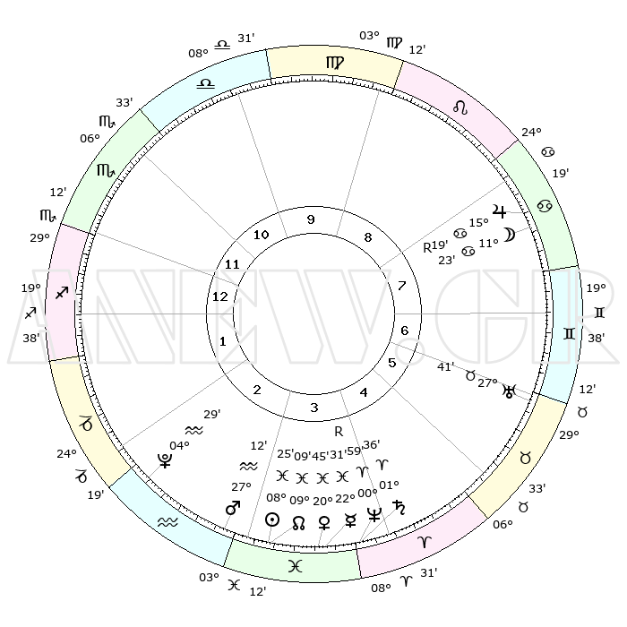 | | ΘΕΣΕΙΣ ΠΛΑΝΗΤΩΝ ΑΣΤΡΟΛΟΓΙΚΟΥ ΧΑΡΤΗ ΤΗΣ ΣΤΙΓΜΗΣ ΑΥΤΗΣ | | | | Πλανήτης | Ζώδιο | Μοίρες | Δεκαήμ. | Σε οίκο | Απόκλιση | | Ακμές των οίκων | | Ηλιος | Ιχθείς | 08°22' | Πρώτο | 3 | 08 S 26 | | 1ος | 04°07' | Τοξότης | | Σελήνη | Καρκίνος | 10°39' | Δεύτερο | 8 | 27 N 29 | | 2ος | 05°51' | Αιγόκερως | | Ερμής | Ιχθείς | 22°32'R | Τρίτο | 4 | 00 S 16 | | 3ος | 12°14' | Υδροχόος | | Αφροδίτη | Ιχθείς | 20°42' | Τρίτο | 4 | 04 S 58 | | 4ος | 18°20' | Ιχθείς | | Αρης | Υδροχόος | 27°09' | Τρίτο | 3 | 13 S 29 | | 5ος | 18°49' | Κριός | | Δίας | Καρκίνος | 15°20'R | Δεύτερο | 8 | 22 N 54 | | 6ος | 13°19' | Ταύρος | | Κρόνος | Κριός | 01°36' | Πρώτο | 4 | 01 S 19 | | 7ος | 04°07' | Δίδυμοι | | Ουρανός | Ταύρος | 27°41' | Τρίτο | 6 | 19 N 28 | | 8ος | 05°51' | Καρκίνος | | Ποσειδώνας | Κριός | 00°59' | Πρώτο | 4 | 00 S 49 | | 9ος | 12°14' | Λέων | | Πλούτωνας | Υδροχόος | 04°29' | Πρώτο | 2 | 22 S 53 | | 10ος | 18°20' | Παρθένος | | Β. Δεσμός | Ιχθείς | 09°09' | Πρώτο | 3 | 08 S 08 | | 11ος | 18°49' | Ζυγός | | Ωροσκόπος | Τοξότης | 04°07' | Πρώτο | | | 12ος | 13°19' | Σκορπιός | | Μεσουράνημα | Παρθένος | 18°20' | Δεύτερο | | | |