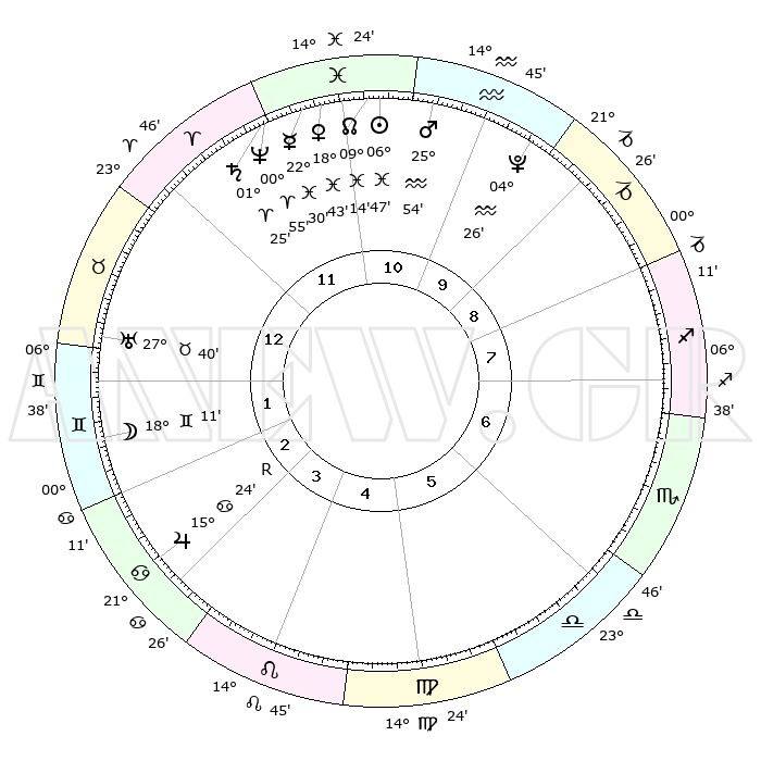 | | ΘΕΣΕΙΣ ΠΛΑΝΗΤΩΝ ΑΣΤΡΟΛΟΓΙΚΟΥ ΧΑΡΤΗ ΤΗΣ ΣΤΙΓΜΗΣ ΑΥΤΗΣ | | | | Πλανήτης | Ζώδιο | Μοίρες | Δεκαήμ. | Σε οίκο | Απόκλιση | | Ακμές των οίκων | | Ηλιος | Ιχθείς | 06°43' | Πρώτο | 11 | 09 S 03 | | 1ος | 09°01' | Ταύρος | | Σελήνη | Δίδυμοι | 17°19' | Δεύτερο | 2 | 28 N 02 | | 2ος | 08°48' | Δίδυμοι | | Ερμής | Ιχθείς | 22°29' | Τρίτο | 11 | 00 S 37 | | 3ος | 01°30' | Καρκίνος | | Αφροδίτη | Ιχθείς | 18°38' | Δεύτερο | 11 | 05 S 47 | | 4ος | 23°18' | Καρκίνος | | Αρης | Υδροχόος | 25°51' | Τρίτο | 11 | 13 S 56 | | 5ος | 18°42' | Λέων | | Δίας | Καρκίνος | 15°24'R | Δεύτερο | 3 | 22 N 53 | | 6ος | 23°13' | Παρθένος | | Κρόνος | Κριός | 01°24' | Πρώτο | 12 | 01 S 24 | | 7ος | 09°01' | Σκορπιός | | Ουρανός | Ταύρος | 27°39' | Τρίτο | 1 | 19 N 27 | | 8ος | 08°48' | Τοξότης | | Ποσειδώνας | Κριός | 00°55' | Πρώτο | 12 | 00 S 50 | | 9ος | 01°30' | Αιγόκερως | | Πλούτωνας | Υδροχόος | 04°26' | Πρώτο | 10 | 22 S 53 | | 10ος | 23°18' | Αιγόκερως | | Β. Δεσμός | Ιχθείς | 09°14' | Πρώτο | 11 | 08 S 06 | | 11ος | 18°42' | Υδροχόος | | Ωροσκόπος | Ταύρος | 09°01' | Πρώτο | | | 12ος | 23°13' | Ιχθείς | | Μεσουράνημα | Αιγόκερως | 23°18' | Τρίτο | | | |