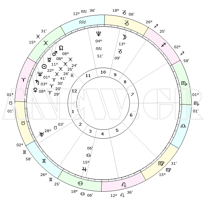 | | ΘΕΣΕΙΣ ΠΛΑΝΗΤΩΝ ΑΣΤΡΟΛΟΓΙΚΟΥ ΧΑΡΤΗ ΤΗΣ ΣΤΙΓΜΗΣ ΑΥΤΗΣ | | | | Πλανήτης | Ζώδιο | Μοίρες | Δεκαήμ. | Σε οίκο | Απόκλιση | | Ακμές των οίκων | | Ηλιος | Ιχθείς | 22°38' | Τρίτο | 12 | 02 S 55 | | 1ος | 28°03' | Ιχθείς | | Σελήνη | Αιγόκερως | 12°27' | Δεύτερο | 10 | 27 S 14 | | 2ος | 08°48' | Ταύρος | | Ερμής | Ιχθείς | 11°28'R | Δεύτερο | 12 | 04 S 39 | | 3ος | 06°31' | Δίδυμοι | | Αφροδίτη | Κριός | 08°25' | Πρώτο | 1 | 02 N 20 | | 4ος | 28°54' | Δίδυμοι | | Αρης | Ιχθείς | 08°22' | Πρώτο | 12 | 09 S 26 | | 5ος | 21°08' | Καρκίνος | | Δίας | Καρκίνος | 15°06' | Δεύτερο | 4 | 22 N 56 | | 6ος | 18°14' | Λέων | | Κρόνος | Κριός | 03°19' | Πρώτο | 1 | 00 S 38 | | 7ος | 28°03' | Παρθένος | | Ουρανός | Ταύρος | 28°03' | Τρίτο | 2 | 19 N 33 | | 8ος | 08°48' | Σκορπιός | | Ποσειδώνας | Κριός | 01°30' | Πρώτο | 1 | 00 S 36 | | 9ος | 06°31' | Τοξότης | | Πλούτωνας | Υδροχόος | 04°51' | Πρώτο | 11 | 22 S 50 | | 10ος | 28°54' | Τοξότης | | Β. Δεσμός | Ιχθείς | 08°24' | Πρώτο | 12 | 08 S 25 | | 11ος | 21°08' | Αιγόκερως | | Ωροσκόπος | Ιχθείς | 28°03' | Τρίτο | | | 12ος | 18°14' | Υδροχόος | | Μεσουράνημα | Τοξότης | 28°54' | Τρίτο | | | |
