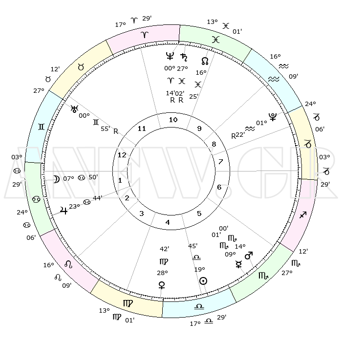 | ΘΕΣΕΙΣ ΠΛΑΝΗΤΩΝ ΑΣΤΡΟΛΟΓΙΚΟΥ ΧΑΡΤΗ ΤΗΣ ΣΤΙΓΜΗΣ ΑΥΤΗΣ | | Πλανήτης | Ζώδιο | Μοίρες | Δεκαήμ. | Σε οίκο | Απόκλιση | | Ακμές των οίκων | Ηλιος | Ζυγός | 19°38' | Δεύτερο | 6 | 07 S 41 | | 1ος | 23°25' | Ταύρος | Σελήνη | Καρκίνος | 06°21' | Πρώτο | 2 | 28 N 13 | | 2ος | 19°38' | Δίδυμοι | Ερμής | Σκορπιός | 08°52' | Πρώτο | 6 | 15 S 51 | | 3ος | 11°21' | Καρκίνος | Αφροδίτη | Παρθένος | 28°34' | Τρίτο | 5 | 01 N 56 | | 4ος | 03°41' | Λέων | Αρης | Σκορπιός | 13°56' | Δεύτερο | 6 | 16 S 12 | | 5ος | 01°04' | Παρθένος | Δίας | Καρκίνος | 23°44' | Τρίτο | 3 | 21 N 24 | | 6ος | 08°23' | Ζυγός | Κρόνος | Ιχθείς | 27°02'R | Τρίτο | 11 | 03 S 29 | | 7ος | 23°25' | Σκορπιός | Ουρανός | Δίδυμοι | 00°55'R | Πρώτο | 1 | 20 N 08 | | 8ος | 19°38' | Τοξότης | Ποσειδώνας | Κριός | 00°14'R | Πρώτο | 11 | 01 S 10 | | 9ος | 11°21' | Αιγόκερως | Πλούτωνας | Υδροχόος | 01°22'R | Πρώτο | 9 | 23 S 32 | | 10ος | 03°41' | Υδροχόος | Β. Δεσμός | Ιχθείς | 16°25' | Δεύτερο | 11 | 05 S 21 | | 11ος | 01°04' | Ιχθείς | Ωροσκόπος | Ταύρος | 23°25' | Τρίτο | | | 12ος | 08°23' | Κριός | Μεσουράνημα | Υδροχόος | 03°41' | Πρώτο | | | |