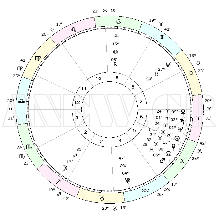 | | ΘΕΣΕΙΣ ΠΛΑΝΗΤΩΝ ΑΣΤΡΟΛΟΓΙΚΟΥ ΧΑΡΤΗ ΤΗΣ ΣΤΙΓΜΗΣ ΑΥΤΗΣ | | | | Πλανήτης | Ζώδιο | Μοίρες | Δεκαήμ. | Σε οίκο | Απόκλιση | | Ακμές των οίκων | | Ηλιος | Ιχθείς | 20°05' | Τρίτο | 7 | 03 S 56 | | 1ος | 12°54' | Παρθένος | | Σελήνη | Τοξότης | 11°60' | Δεύτερο | 4 | 27 S 26 | | 2ος | 08°04' | Ζυγός | | Ερμής | Ιχθείς | 13°41'R | Δεύτερο | 7 | 03 S 23 | | 3ος | 07°42' | Σκορπιός | | Αφροδίτη | Κριός | 05°15' | Πρώτο | 7 | 01 N 01 | | 4ος | 10°38' | Τοξότης | | Αρης | Ιχθείς | 06°22' | Πρώτο | 6 | 10 S 11 | | 5ος | 14°05' | Αιγόκερως | | Δίας | Καρκίνος | 15°05'R | Δεύτερο | 11 | 22 N 56 | | 6ος | 15°14' | Υδροχόος | | Κρόνος | Κριός | 03°00' | Πρώτο | 7 | 00 S 45 | | 7ος | 12°54' | Ιχθείς | | Ουρανός | Ταύρος | 27°59' | Τρίτο | 9 | 19 N 32 | | 8ος | 08°04' | Κριός | | Ποσειδώνας | Κριός | 01°24' | Πρώτο | 7 | 00 S 38 | | 9ος | 07°42' | Ταύρος | | Πλούτωνας | Υδροχόος | 04°47' | Πρώτο | 5 | 22 S 50 | | 10ος | 10°38' | Δίδυμοι | | Β. Δεσμός | Ιχθείς | 08°32' | Πρώτο | 6 | 08 S 22 | | 11ος | 14°05' | Καρκίνος | | Ωροσκόπος | Παρθένος | 12°54' | Δεύτερο | | | 12ος | 15°14' | Λέων | | Μεσουράνημα | Δίδυμοι | 10°38' | Δεύτερο | | | |