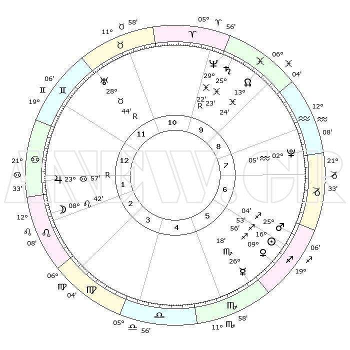 | | ΘΕΣΕΙΣ ΠΛΑΝΗΤΩΝ ΑΣΤΡΟΛΟΓΙΚΟΥ ΧΑΡΤΗ ΤΗΣ ΣΤΙΓΜΗΣ ΑΥΤΗΣ | | | | Πλανήτης | Ζώδιο | Μοίρες | Δεκαήμ. | Σε οίκο | Απόκλιση | | Ακμές των οίκων | | Ηλιος | Τοξότης | 16°51' | Δεύτερο | 6 | 22 S 47 | | 1ος | 10°34' | Καρκίνος | | Σελήνη | Λέων | 08°12' | Πρώτο | 2 | 21 N 00 | | 2ος | 00°59' | Λέων | | Ερμής | Σκορπιός | 26°16' | Τρίτο | 5 | 17 S 07 | | 3ος | 23°40' | Λέων | | Αφροδίτη | Τοξότης | 09°53' | Πρώτο | 6 | 21 S 31 | | 4ος | 21°44' | Παρθένος | | Αρης | Τοξότης | 25°02' | Τρίτο | 6 | 24 S 04 | | 5ος | 27°04' | Ζυγός | | Δίας | Καρκίνος | 23°57'R | Τρίτο | 1 | 21 N 29 | | 6ος | 05°56' | Τοξότης | | Κρόνος | Ιχθείς | 25°23' | Τρίτο | 10 | 03 S 59 | | 7ος | 10°34' | Αιγόκερως | | Ουρανός | Ταύρος | 28°44'R | Τρίτο | 11 | 19 N 40 | | 8ος | 00°59' | Υδροχόος | | Ποσειδώνας | Ιχθείς | 29°22'R | Τρίτο | 10 | 01 S 29 | | 9ος | 23°40' | Υδροχόος | | Πλούτωνας | Υδροχόος | 02°05' | Πρώτο | 8 | 23 S 22 | | 10ος | 21°44' | Ιχθείς | | Β. Δεσμός | Ιχθείς | 13°24' | Δεύτερο | 9 | 06 S 31 | | 11ος | 27°04' | Κριός | | Ωροσκόπος | Καρκίνος | 10°34' | Δεύτερο | | | 12ος | 05°56' | Δίδυμοι | | Μεσουράνημα | Ιχθείς | 21°44' | Τρίτο | | | |