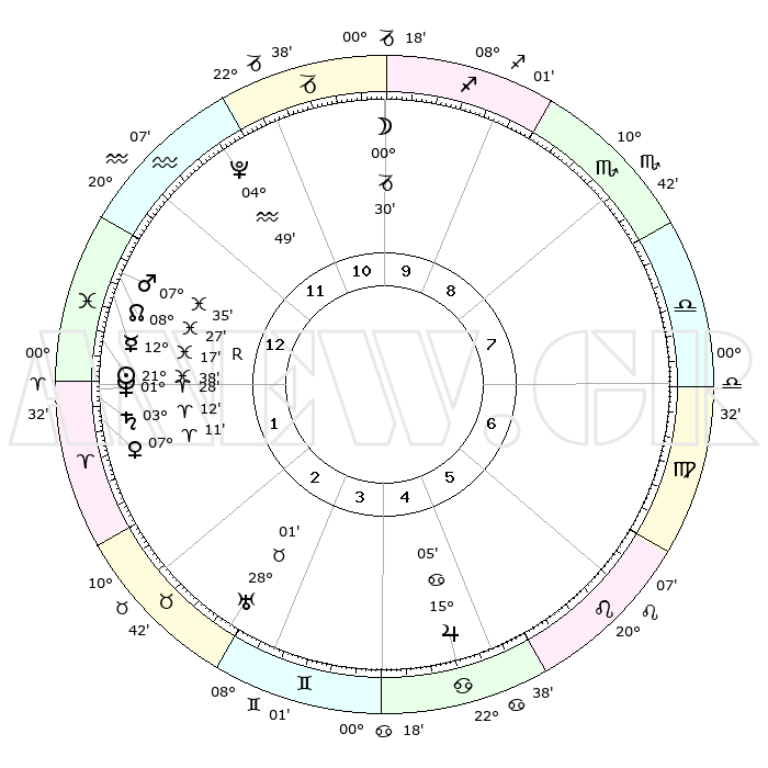 | | ΘΕΣΕΙΣ ΠΛΑΝΗΤΩΝ ΑΣΤΡΟΛΟΓΙΚΟΥ ΧΑΡΤΗ ΤΗΣ ΣΤΙΓΜΗΣ ΑΥΤΗΣ | | | | Πλανήτης | Ζώδιο | Μοίρες | Δεκαήμ. | Σε οίκο | Απόκλιση | | Ακμές των οίκων | | Ηλιος | Ιχθείς | 21°35' | Τρίτο | 1 | 03 S 20 | | 1ος | 26°36' | Υδροχόος | | Σελήνη | Τοξότης | 29°47' | Τρίτο | 10 | 28 S 22 | | 2ος | 12°14' | Κριός | | Ερμής | Ιχθείς | 12°20'R | Δεύτερο | 1 | 04 S 08 | | 3ος | 15°38' | Ταύρος | | Αφροδίτη | Κριός | 07°06' | Πρώτο | 1 | 01 N 47 | | 4ος | 10°23' | Δίδυμοι | | Αρης | Ιχθείς | 07°32' | Πρώτο | 1 | 09 S 45 | | 5ος | 02°05' | Καρκίνος | | Δίας | Καρκίνος | 15°05' | Δεύτερο | 5 | 22 N 56 | | 6ος | 25°19' | Καρκίνος | | Κρόνος | Κριός | 03°12' | Πρώτο | 1 | 00 S 41 | | 7ος | 26°36' | Λέων | | Ουρανός | Ταύρος | 28°01' | Τρίτο | 3 | 19 N 33 | | 8ος | 12°14' | Ζυγός | | Ποσειδώνας | Κριός | 01°28' | Πρώτο | 1 | 00 S 37 | | 9ος | 15°38' | Σκορπιός | | Πλούτωνας | Υδροχόος | 04°49' | Πρώτο | 12 | 22 S 50 | | 10ος | 10°23' | Τοξότης | | Β. Δεσμός | Ιχθείς | 08°27' | Πρώτο | 1 | 08 S 24 | | 11ος | 02°05' | Αιγόκερως | | Ωροσκόπος | Υδροχόος | 26°36' | Τρίτο | | | 12ος | 25°19' | Αιγόκερως | | Μεσουράνημα | Τοξότης | 10°23' | Δεύτερο | | | |