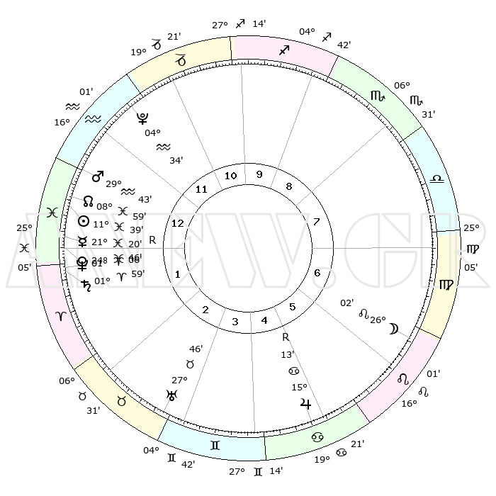| | ΘΕΣΕΙΣ ΠΛΑΝΗΤΩΝ ΑΣΤΡΟΛΟΓΙΚΟΥ ΧΑΡΤΗ ΤΗΣ ΣΤΙΓΜΗΣ ΑΥΤΗΣ | | | | Πλανήτης | Ζώδιο | Μοίρες | Δεκαήμ. | Σε οίκο | Απόκλιση | | Ακμές των οίκων | | Ηλιος | Ιχθείς | 11°35' | Δεύτερο | 1 | 07 S 13 | | 1ος | 20°02' | Υδροχόος | | Σελήνη | Λέων | 25°10' | Τρίτο | 7 | 14 N 19 | | 2ος | 05°51' | Κριός | | Ερμής | Ιχθείς | 21°23'R | Τρίτο | 1 | 00 S 14 | | 3ος | 10°33' | Ταύρος | | Αφροδίτη | Ιχθείς | 24°41' | Τρίτο | 1 | 03 S 21 | | 4ος | 06°03' | Δίδυμοι | | Αρης | Υδροχόος | 29°40' | Τρίτο | 1 | 12 S 36 | | 5ος | 27°53' | Δίδυμοι | | Δίας | Καρκίνος | 15°13'R | Δεύτερο | 5 | 22 N 54 | | 6ος | 20°31' | Καρκίνος | | Κρόνος | Κριός | 01°59' | Πρώτο | 1 | 01 S 10 | | 7ος | 20°02' | Λέων | | Ουρανός | Ταύρος | 27°45' | Τρίτο | 3 | 19 N 29 | | 8ος | 05°51' | Ζυγός | | Ποσειδώνας | Κριός | 01°05' | Πρώτο | 1 | 00 S 46 | | 9ος | 10°33' | Σκορπιός | | Πλούτωνας | Υδροχόος | 04°34' | Πρώτο | 12 | 22 S 52 | | 10ος | 06°03' | Τοξότης | | Β. Δεσμός | Ιχθείς | 08°59' | Πρώτο | 1 | 08 S 12 | | 11ος | 27°53' | Τοξότης | | Ωροσκόπος | Υδροχόος | 20°02' | Τρίτο | | | 12ος | 20°31' | Αιγόκερως | | Μεσουράνημα | Τοξότης | 06°03' | Πρώτο | | | |