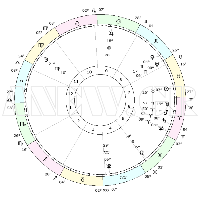 | | ΘΕΣΕΙΣ ΠΛΑΝΗΤΩΝ ΑΣΤΡΟΛΟΓΙΚΟΥ ΧΑΡΤΗ ΤΗΣ ΣΤΙΓΜΗΣ ΑΥΤΗΣ | | | | Πλανήτης | Ζώδιο | Μοίρες | Δεκαήμ. | Σε οίκο | Απόκλιση | | Ακμές των οίκων | | Ηλιος | Ταύρος | 07°23' | Πρώτο | 7 | 13 N 58 | | 1ος | 12°43' | Ζυγός | | Σελήνη | Παρθένος | 20°30' | Τρίτο | 12 | 02 N 42 | | 2ος | 10°08' | Σκορπιός | | Ερμής | Κριός | 19°52' | Δεύτερο | 7 | 05 N 41 | | 3ος | 11°04' | Τοξότης | | Αφροδίτη | Δίδυμοι | 04°13' | Πρώτο | 8 | 21 N 43 | | 4ος | 14°21' | Αιγόκερως | | Αρης | Κριός | 13°48' | Δεύτερο | 7 | 04 N 36 | | 5ος | 17°17' | Υδροχόος | | Δίας | Καρκίνος | 18°28' | Δεύτερο | 10 | 22 N 33 | | 6ος | 17°10' | Ιχθείς | | Κρόνος | Κριός | 08°53' | Πρώτο | 6 | 01 N 32 | | 7ος | 12°43' | Κριός | | Ουρανός | Δίδυμοι | 00°05' | Πρώτο | 8 | 20 N 00 | | 8ος | 10°08' | Ταύρος | | Ποσειδώνας | Κριός | 03°09' | Πρώτο | 6 | 00 N 03 | | 9ος | 11°04' | Δίδυμοι | | Πλούτωνας | Υδροχόος | 05°29' | Πρώτο | 4 | 22 S 48 | | 10ος | 14°21' | Καρκίνος | | Β. Δεσμός | Ιχθείς | 05°60' | Πρώτο | 5 | 09 S 19 | | 11ος | 17°17' | Λέων | | Ωροσκόπος | Ζυγός | 12°43' | Δεύτερο | | | 12ος | 17°10' | Παρθένος | | Μεσουράνημα | Καρκίνος | 14°21' | Δεύτερο | | | |