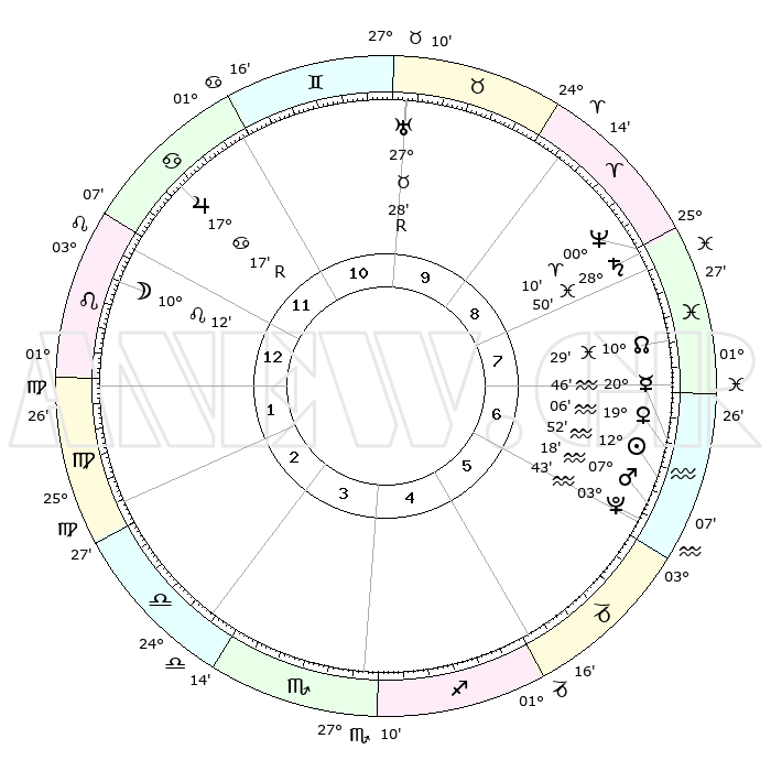 | | ΘΕΣΕΙΣ ΠΛΑΝΗΤΩΝ ΑΣΤΡΟΛΟΓΙΚΟΥ ΧΑΡΤΗ ΤΗΣ ΣΤΙΓΜΗΣ ΑΥΤΗΣ | | | | Πλανήτης | Ζώδιο | Μοίρες | Δεκαήμ. | Σε οίκο | Απόκλιση | | Ακμές των οίκων | | Ηλιος | Υδροχόος | 12°48' | Δεύτερο | 6 | 16 S 58 | | 1ος | 15°31' | Λέων | | Σελήνη | Λέων | 09°25' | Πρώτο | 12 | 20 N 23 | | 2ος | 07°53' | Παρθένος | | Ερμής | Υδροχόος | 20°40' | Τρίτο | 7 | 16 S 21 | | 3ος | 04°59' | Ζυγός | | Αφροδίτη | Υδροχόος | 19°01' | Δεύτερο | 7 | 16 S 25 | | 4ος | 07°26' | Σκορπιός | | Αρης | Υδροχόος | 07°15' | Πρώτο | 6 | 19 S 28 | | 5ος | 12°40' | Τοξότης | | Δίας | Καρκίνος | 17°17'R | Δεύτερο | 12 | 22 N 37 | | 6ος | 16°05' | Αιγόκερως | | Κρόνος | Ιχθείς | 28°49' | Τρίτο | 8 | 02 S 28 | | 7ος | 15°31' | Υδροχόος | | Ουρανός | Ταύρος | 27°28'R | Τρίτο | 10 | 19 N 24 | | 8ος | 07°53' | Ιχθείς | | Ποσειδώνας | Κριός | 00°10' | Πρώτο | 8 | 01 S 09 | | 9ος | 04°59' | Κριός | | Πλούτωνας | Υδροχόος | 03°43' | Πρώτο | 6 | 23 S 01 | | 10ος | 07°26' | Ταύρος | | Β. Δεσμός | Ιχθείς | 10°30' | Δεύτερο | 8 | 07 S 38 | | 11ος | 12°40' | Δίδυμοι | | Ωροσκόπος | Λέων | 15°31' | Δεύτερο | | | 12ος | 16°05' | Καρκίνος | | Μεσουράνημα | Ταύρος | 07°26' | Πρώτο | | | |