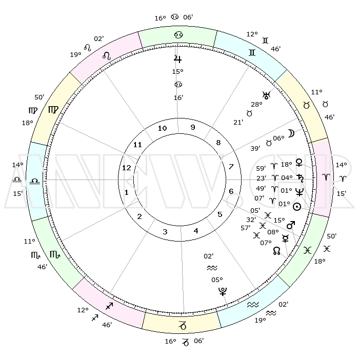 | | ΘΕΣΕΙΣ ΠΛΑΝΗΤΩΝ ΑΣΤΡΟΛΟΓΙΚΟΥ ΧΑΡΤΗ ΤΗΣ ΣΤΙΓΜΗΣ ΑΥΤΗΣ | | | | Πλανήτης | Ζώδιο | Μοίρες | Δεκαήμ. | Σε οίκο | Απόκλιση | | Ακμές των οίκων | | Ηλιος | Κριός | 01°03' | Πρώτο | 7 | 00 N 25 | | 1ος | 21°57' | Παρθένος | | Σελήνη | Ταύρος | 05°33' | Πρώτο | 8 | 17 N 30 | | 2ος | 17°54' | Ζυγός | | Ερμής | Ιχθείς | 08°32' | Πρώτο | 6 | 07 S 39 | | 3ος | 18°00' | Σκορπιός | | Αφροδίτη | Κριός | 18°53' | Δεύτερο | 8 | 06 N 37 | | 4ος | 20°56' | Τοξότης | | Αρης | Ιχθείς | 15°01' | Δεύτερο | 6 | 06 S 53 | | 5ος | 24°04' | Αιγόκερως | | Δίας | Καρκίνος | 15°16' | Δεύτερο | 10 | 22 N 55 | | 6ος | 24°49' | Υδροχόος | | Κρόνος | Κριός | 04°22' | Πρώτο | 7 | 00 S 13 | | 7ος | 21°57' | Ιχθείς | | Ουρανός | Ταύρος | 28°21' | Τρίτο | 9 | 19 N 37 | | 8ος | 17°54' | Κριός | | Ποσειδώνας | Κριός | 01°49' | Πρώτο | 7 | 00 S 29 | | 9ος | 18°00' | Ταύρος | | Πλούτωνας | Υδροχόος | 05°02' | Πρώτο | 5 | 22 S 48 | | 10ος | 20°56' | Δίδυμοι | | Β. Δεσμός | Ιχθείς | 07°57' | Πρώτο | 6 | 08 S 35 | | 11ος | 24°04' | Καρκίνος | | Ωροσκόπος | Παρθένος | 21°57' | Τρίτο | | | 12ος | 24°49' | Λέων | | Μεσουράνημα | Δίδυμοι | 20°56' | Τρίτο | | | |