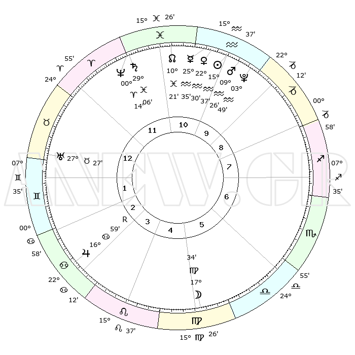| | ΘΕΣΕΙΣ ΠΛΑΝΗΤΩΝ ΑΣΤΡΟΛΟΓΙΚΟΥ ΧΑΡΤΗ ΤΗΣ ΣΤΙΓΜΗΣ ΑΥΤΗΣ | | | | Πλανήτης | Ζώδιο | Μοίρες | Δεκαήμ. | Σε οίκο | Απόκλιση | | Ακμές των οίκων | | Ηλιος | Υδροχόος | 15°33' | Δεύτερο | 11 | 16 S 10 | | 1ος | 03°48' | Ταύρος | | Σελήνη | Παρθένος | 16°36' | Δεύτερο | 5 | 04 N 39 | | 2ος | 04°58' | Δίδυμοι | | Ερμής | Υδροχόος | 25°27' | Τρίτο | 11 | 14 S 34 | | 3ος | 28°09' | Δίδυμοι | | Αφροδίτη | Υδροχόος | 22°25' | Τρίτο | 11 | 15 S 22 | | 4ος | 19°52' | Καρκίνος | | Αρης | Υδροχόος | 09°23' | Πρώτο | 10 | 18 S 55 | | 5ος | 14°40' | Λέων | | Δίας | Καρκίνος | 16°60'R | Δεύτερο | 3 | 22 N 40 | | 6ος | 18°08' | Παρθένος | | Κρόνος | Ιχθείς | 29°06' | Τρίτο | 12 | 02 S 21 | | 7ος | 03°48' | Σκορπιός | | Ουρανός | Ταύρος | 27°27' | Τρίτο | 1 | 19 N 24 | | 8ος | 04°58' | Τοξότης | | Ποσειδώνας | Κριός | 00°14' | Πρώτο | 12 | 01 S 07 | | 9ος | 28°09' | Τοξότης | | Πλούτωνας | Υδροχόος | 03°48' | Πρώτο | 10 | 23 S 00 | | 10ος | 19°52' | Αιγόκερως | | Β. Δεσμός | Ιχθείς | 10°21' | Δεύτερο | 11 | 07 S 41 | | 11ος | 14°40' | Υδροχόος | | Ωροσκόπος | Ταύρος | 03°48' | Πρώτο | | | 12ος | 18°08' | Ιχθείς | | Μεσουράνημα | Αιγόκερως | 19°52' | Δεύτερο | | | |
