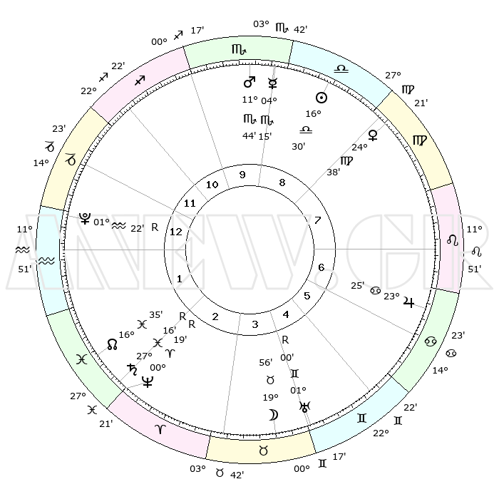 | ΘΕΣΕΙΣ ΠΛΑΝΗΤΩΝ ΑΣΤΡΟΛΟΓΙΚΟΥ ΧΑΡΤΗ ΤΗΣ ΣΤΙΓΜΗΣ ΑΥΤΗΣ | | Πλανήτης | Ζώδιο | Μοίρες | Δεκαήμ. | Σε οίκο | Απόκλιση | | Ακμές των οίκων | Ηλιος | Ζυγός | 16°22' | Δεύτερο | 10 | 06 S 26 | | 1ος | 19°59' | Τοξότης | Σελήνη | Ταύρος | 17°51' | Δεύτερο | 5 | 21 N 28 | | 2ος | 24°44' | Αιγόκερως | Ερμής | Σκορπιός | 04°03' | Πρώτο | 10 | 13 S 54 | | 3ος | 03°41' | Ιχθείς | Αφροδίτη | Παρθένος | 24°27' | Τρίτο | 9 | 03 N 32 | | 4ος | 08°57' | Κριός | Αρης | Σκορπιός | 11°38' | Δεύτερο | 11 | 15 S 29 | | 5ος | 06°56' | Ταύρος | Δίας | Καρκίνος | 23°24' | Τρίτο | 7 | 21 N 26 | | 6ος | 29°33' | Ταύρος | Κρόνος | Ιχθείς | 27°16'R | Τρίτο | 3 | 03 S 23 | | 7ος | 19°59' | Δίδυμοι | Ουρανός | Δίδυμοι | 01°01'R | Πρώτο | 6 | 20 N 09 | | 8ος | 24°44' | Καρκίνος | Ποσειδώνας | Κριός | 00°19'R | Πρώτο | 3 | 01 S 08 | | 9ος | 03°41' | Παρθένος | Πλούτωνας | Υδροχόος | 01°22'R | Πρώτο | 2 | 23 S 32 | | 10ος | 08°57' | Ζυγός | Β. Δεσμός | Ιχθείς | 16°36' | Δεύτερο | 3 | 05 S 17 | | 11ος | 06°56' | Σκορπιός | Ωροσκόπος | Τοξότης | 19°59' | Δεύτερο | | | 12ος | 29°33' | Σκορπιός | Μεσουράνημα | Ζυγός | 08°57' | Πρώτο | | | |