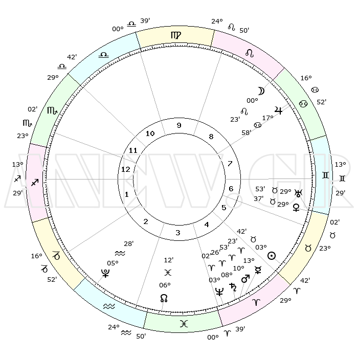 | | ΘΕΣΕΙΣ ΠΛΑΝΗΤΩΝ ΑΣΤΡΟΛΟΓΙΚΟΥ ΧΑΡΤΗ ΤΗΣ ΣΤΙΓΜΗΣ ΑΥΤΗΣ | | | | Πλανήτης | Ζώδιο | Μοίρες | Δεκαήμ. | Σε οίκο | Απόκλιση | | Ακμές των οίκων | | Ηλιος | Ταύρος | 03°38' | Πρώτο | 6 | 12 N 43 | | 1ος | 23°48' | Σκορπιός | | Σελήνη | Καρκίνος | 29°27' | Τρίτο | 9 | 23 N 20 | | 2ος | 24°09' | Τοξότης | | Ερμής | Κριός | 13°16' | Δεύτερο | 5 | 02 N 56 | | 3ος | 28°52' | Αιγόκερως | | Αφροδίτη | Ταύρος | 29°32' | Τρίτο | 7 | 20 N 36 | | 4ος | 04°41' | Ιχθείς | | Αρης | Κριός | 10°50' | Δεύτερο | 5 | 03 N 26 | | 5ος | 06°24' | Κριός | | Δίας | Καρκίνος | 17°58' | Δεύτερο | 8 | 22 N 37 | | 6ος | 02°18' | Ταύρος | | Κρόνος | Κριός | 08°26' | Πρώτο | 5 | 01 N 21 | | 7ος | 23°48' | Ταύρος | | Ουρανός | Ταύρος | 29°53' | Τρίτο | 7 | 19 N 57 | | 8ος | 24°09' | Δίδυμοι | | Ποσειδώνας | Κριός | 03°02' | Πρώτο | 4 | 00 S 00 | | 9ος | 28°52' | Καρκίνος | | Πλούτωνας | Υδροχόος | 05°28' | Πρώτο | 3 | 22 S 48 | | 10ος | 04°41' | Παρθένος | | Β. Δεσμός | Ιχθείς | 06°12' | Πρώτο | 4 | 09 S 14 | | 11ος | 06°24' | Ζυγός | | Ωροσκόπος | Σκορπιός | 23°48' | Τρίτο | | | 12ος | 02°18' | Σκορπιός | | Μεσουράνημα | Παρθένος | 04°41' | Πρώτο | | | |