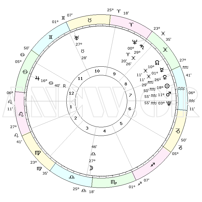 | | ΘΕΣΕΙΣ ΠΛΑΝΗΤΩΝ ΑΣΤΡΟΛΟΓΙΚΟΥ ΧΑΡΤΗ ΤΗΣ ΣΤΙΓΜΗΣ ΑΥΤΗΣ | | | | Πλανήτης | Ζώδιο | Μοίρες | Δεκαήμ. | Σε οίκο | Απόκλιση | | Ακμές των οίκων | | Ηλιος | Υδροχόος | 18°46' | Δεύτερο | 8 | 15 S 12 | | 1ος | 16°43' | Καρκίνος | | Σελήνη | Ζυγός | 26°58' | Τρίτο | 4 | 14 S 01 | | 2ος | 07°10' | Λέων | | Ερμής | Ιχθείς | 01°04' | Πρώτο | 9 | 12 S 16 | | 3ος | 00°31' | Παρθένος | | Αφροδίτη | Υδροχόος | 26°24' | Τρίτο | 8 | 14 S 04 | | 4ος | 29°36' | Παρθένος | | Αρης | Υδροχόος | 11°52' | Δεύτερο | 8 | 18 S 15 | | 5ος | 05°26' | Σκορπιός | | Δίας | Καρκίνος | 16°40'R | Δεύτερο | 12 | 22 N 42 | | 6ος | 13°22' | Τοξότης | | Κρόνος | Ιχθείς | 29°25' | Τρίτο | 9 | 02 S 13 | | 7ος | 16°43' | Αιγόκερως | | Ουρανός | Ταύρος | 27°28' | Τρίτο | 11 | 19 N 24 | | 8ος | 07°10' | Υδροχόος | | Ποσειδώνας | Κριός | 00°20' | Πρώτο | 10 | 01 S 04 | | 9ος | 00°31' | Ιχθείς | | Πλούτωνας | Υδροχόος | 03°54' | Πρώτο | 7 | 22 S 59 | | 10ος | 29°36' | Ιχθείς | | Β. Δεσμός | Ιχθείς | 10°11' | Δεύτερο | 9 | 07 S 45 | | 11ος | 05°26' | Ταύρος | | Ωροσκόπος | Καρκίνος | 16°43' | Δεύτερο | | | 12ος | 13°22' | Δίδυμοι | | Μεσουράνημα | Ιχθείς | 29°36' | Τρίτο | | | |