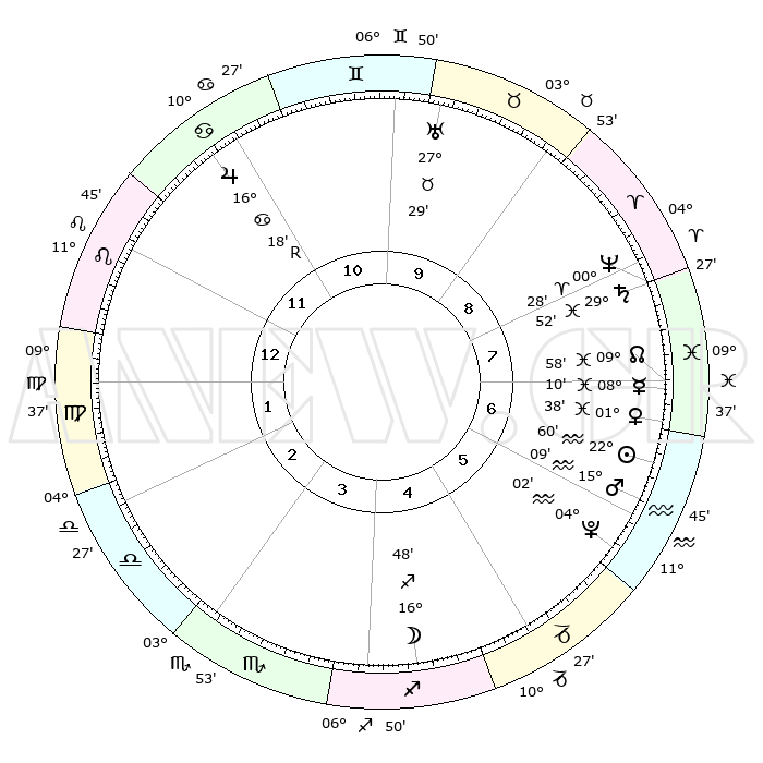 | | ΘΕΣΕΙΣ ΠΛΑΝΗΤΩΝ ΑΣΤΡΟΛΟΓΙΚΟΥ ΧΑΡΤΗ ΤΗΣ ΣΤΙΓΜΗΣ ΑΥΤΗΣ | | | | Πλανήτης | Ζώδιο | Μοίρες | Δεκαήμ. | Σε οίκο | Απόκλιση | | Ακμές των οίκων | | Ηλιος | Υδροχόος | 22°55' | Τρίτο | 7 | 13 S 52 | | 1ος | 18°12' | Λέων | | Σελήνη | Τοξότης | 15°55' | Δεύτερο | 5 | 27 S 53 | | 2ος | 10°49' | Παρθένος | | Ερμής | Ιχθείς | 08°03' | Πρώτο | 7 | 09 S 08 | | 3ος | 08°15' | Ζυγός | | Αφροδίτη | Ιχθείς | 01°32' | Πρώτο | 7 | 12 S 17 | | 4ος | 10°51' | Σκορπιός | | Αρης | Υδροχόος | 15°05' | Δεύτερο | 6 | 17 S 20 | | 5ος | 15°53' | Τοξότης | | Δίας | Καρκίνος | 16°18'R | Δεύτερο | 11 | 22 N 45 | | 6ος | 18°59' | Αιγόκερως | | Κρόνος | Ιχθείς | 29°51' | Τρίτο | 8 | 02 S 02 | | 7ος | 18°12' | Υδροχόος | | Ουρανός | Ταύρος | 27°29' | Τρίτο | 10 | 19 N 25 | | 8ος | 10°49' | Ιχθείς | | Ποσειδώνας | Κριός | 00°28' | Πρώτο | 8 | 01 S 01 | | 9ος | 08°15' | Κριός | | Πλούτωνας | Υδροχόος | 04°02' | Πρώτο | 6 | 22 S 58 | | 10ος | 10°51' | Ταύρος | | Β. Δεσμός | Ιχθείς | 09°58' | Πρώτο | 7 | 07 S 50 | | 11ος | 15°53' | Δίδυμοι | | Ωροσκόπος | Λέων | 18°12' | Δεύτερο | | | 12ος | 18°59' | Καρκίνος | | Μεσουράνημα | Ταύρος | 10°51' | Δεύτερο | | | |