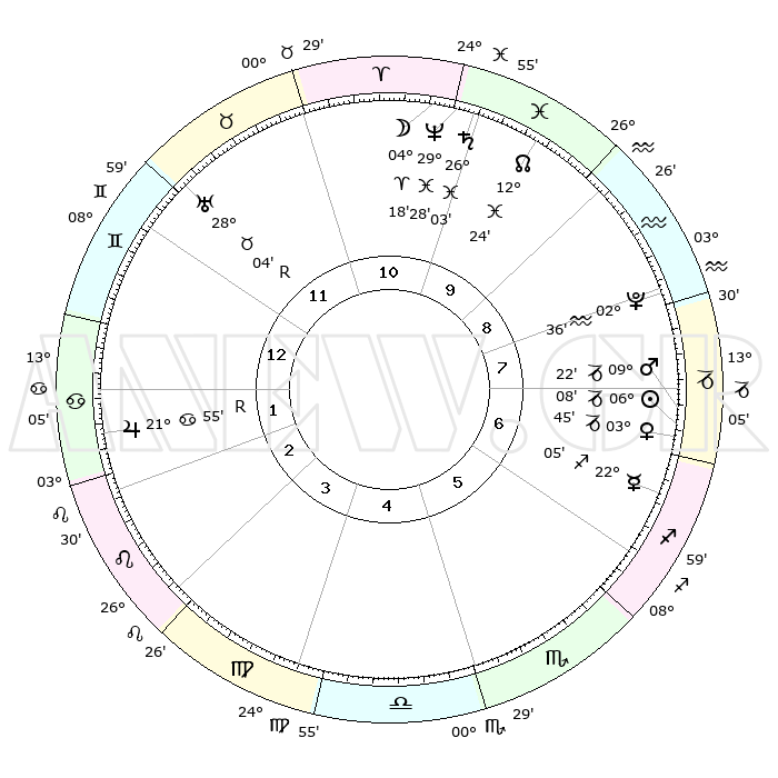 | | ΘΕΣΕΙΣ ΠΛΑΝΗΤΩΝ ΑΣΤΡΟΛΟΓΙΚΟΥ ΧΑΡΤΗ ΤΗΣ ΣΤΙΓΜΗΣ ΑΥΤΗΣ | | | | Πλανήτης | Ζώδιο | Μοίρες | Δεκαήμ. | Σε οίκο | Απόκλιση | | Ακμές των οίκων | | Ηλιος | Αιγόκερως | 06°04' | Πρώτο | 7 | 23 S 18 | | 1ος | 18°16' | Δίδυμοι | | Σελήνη | Κριός | 03°17' | Πρώτο | 11 | 03 N 03 | | 2ος | 10°07' | Καρκίνος | | Ερμής | Τοξότης | 21°59' | Τρίτο | 7 | 23 S 15 | | 3ος | 01°24' | Λέων | | Αφροδίτη | Αιγόκερως | 03°39' | Πρώτο | 7 | 23 S 43 | | 4ος | 26°01' | Λέων | | Αρης | Αιγόκερως | 09°19' | Πρώτο | 7 | 23 S 58 | | 5ος | 27°52' | Παρθένος | | Δίας | Καρκίνος | 21°55'R | Τρίτο | 2 | 21 N 52 | | 6ος | 08°08' | Σκορπιός | | Κρόνος | Ιχθείς | 26°03' | Τρίτο | 10 | 03 S 40 | | 7ος | 18°16' | Τοξότης | | Ουρανός | Ταύρος | 28°04'R | Τρίτο | 12 | 19 N 32 | | 8ος | 10°07' | Αιγόκερως | | Ποσειδώνας | Ιχθείς | 29°27' | Τρίτο | 11 | 01 S 26 | | 9ος | 01°24' | Υδροχόος | | Πλούτωνας | Υδροχόος | 02°35' | Πρώτο | 9 | 23 S 15 | | 10ος | 26°01' | Υδροχόος | | Β. Δεσμός | Ιχθείς | 12°24' | Δεύτερο | 10 | 06 S 54 | | 11ος | 27°52' | Ιχθείς | | Ωροσκόπος | Δίδυμοι | 18°16' | Δεύτερο | | | 12ος | 08°08' | Ταύρος | | Μεσουράνημα | Υδροχόος | 26°01' | Τρίτο | | | |