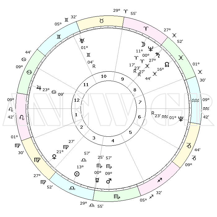 | ΘΕΣΕΙΣ ΠΛΑΝΗΤΩΝ ΑΣΤΡΟΛΟΓΙΚΟΥ ΧΑΡΤΗ ΤΗΣ ΣΤΙΓΜΗΣ ΑΥΤΗΣ | | Πλανήτης | Ζώδιο | Μοίρες | Δεκαήμ. | Σε οίκο | Απόκλιση | | Ακμές των οίκων | Ηλιος | Ζυγός | 13°52' | Δεύτερο | 4 | 05 S 28 | | 1ος | 11°55' | Καρκίνος | Σελήνη | Κριός | 09°54' | Πρώτο | 10 | 05 N 42 | | 2ος | 02°20' | Λέων | Ερμής | Σκορπιός | 00°17' | Πρώτο | 5 | 12 S 19 | | 3ος | 25°09' | Λέων | Αφροδίτη | Παρθένος | 21°20' | Τρίτο | 3 | 04 N 44 | | 4ος | 23°27' | Παρθένος | Αρης | Σκορπιός | 09°53' | Πρώτο | 5 | 14 S 55 | | 5ος | 28°55' | Ζυγός | Δίας | Καρκίνος | 23°08' | Τρίτο | 1 | 21 N 29 | | 6ος | 07°35' | Τοξότης | Κρόνος | Ιχθείς | 27°27'R | Τρίτο | 10 | 03 S 19 | | 7ος | 11°55' | Αιγόκερως | Ουρανός | Δίδυμοι | 01°05'R | Πρώτο | 11 | 20 N 10 | | 8ος | 02°20' | Υδροχόος | Ποσειδώνας | Κριός | 00°23'R | Πρώτο | 10 | 01 S 06 | | 9ος | 25°09' | Υδροχόος | Πλούτωνας | Υδροχόος | 01°23'R | Πρώτο | 7 | 23 S 32 | | 10ος | 23°27' | Ιχθείς | Β. Δεσμός | Ιχθείς | 16°44' | Δεύτερο | 9 | 05 S 14 | | 11ος | 28°55' | Κριός | Ωροσκόπος | Καρκίνος | 11°55' | Δεύτερο | | | 12ος | 07°35' | Δίδυμοι | Μεσουράνημα | Ιχθείς | 23°27' | Τρίτο | | | |