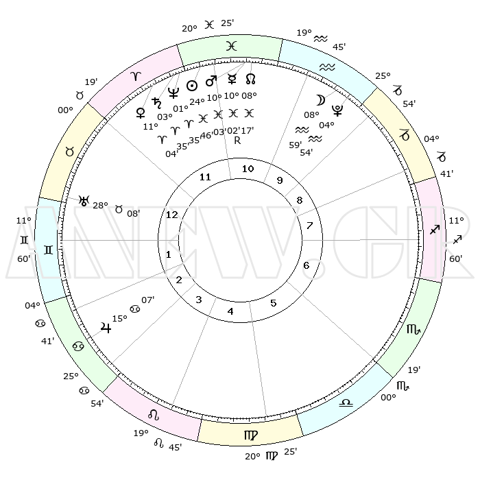 | | ΘΕΣΕΙΣ ΠΛΑΝΗΤΩΝ ΑΣΤΡΟΛΟΓΙΚΟΥ ΧΑΡΤΗ ΤΗΣ ΣΤΙΓΜΗΣ ΑΥΤΗΣ | | | | Πλανήτης | Ζώδιο | Μοίρες | Δεκαήμ. | Σε οίκο | Απόκλιση | | Ακμές των οίκων | | Ηλιος | Ιχθείς | 24°43' | Τρίτο | 11 | 02 S 06 | | 1ος | 22°19' | Ταύρος | | Σελήνη | Υδροχόος | 08°23' | Πρώτο | 10 | 20 S 45 | | 2ος | 18°47' | Δίδυμοι | | Ερμής | Ιχθείς | 10°04'R | Δεύτερο | 11 | 05 S 37 | | 3ος | 10°33' | Καρκίνος | | Αφροδίτη | Κριός | 11°01' | Δεύτερο | 12 | 03 N 24 | | 4ος | 02°50' | Λέων | | Αρης | Ιχθείς | 10°01' | Δεύτερο | 11 | 08 S 49 | | 5ος | 00°03' | Παρθένος | | Δίας | Καρκίνος | 15°07' | Δεύτερο | 3 | 22 N 56 | | 6ος | 07°10' | Ζυγός | | Κρόνος | Κριός | 03°35' | Πρώτο | 11 | 00 S 32 | | 7ος | 22°19' | Σκορπιός | | Ουρανός | Ταύρος | 28°07' | Τρίτο | 1 | 19 N 34 | | 8ος | 18°47' | Τοξότης | | Ποσειδώνας | Κριός | 01°35' | Πρώτο | 11 | 00 S 34 | | 9ος | 10°33' | Αιγόκερως | | Πλούτωνας | Υδροχόος | 04°54' | Πρώτο | 10 | 22 S 49 | | 10ος | 02°50' | Υδροχόος | | Β. Δεσμός | Ιχθείς | 08°17' | Πρώτο | 11 | 08 S 28 | | 11ος | 00°03' | Ιχθείς | | Ωροσκόπος | Ταύρος | 22°19' | Τρίτο | | | 12ος | 07°10' | Κριός | | Μεσουράνημα | Υδροχόος | 02°50' | Πρώτο | | | |