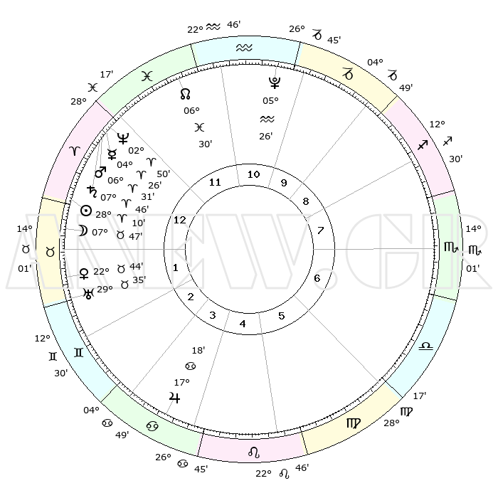 | | ΘΕΣΕΙΣ ΠΛΑΝΗΤΩΝ ΑΣΤΡΟΛΟΓΙΚΟΥ ΧΑΡΤΗ ΤΗΣ ΣΤΙΓΜΗΣ ΑΥΤΗΣ | | | | Πλανήτης | Ζώδιο | Μοίρες | Δεκαήμ. | Σε οίκο | Απόκλιση | | Ακμές των οίκων | | Ηλιος | Κριός | 28°07' | Τρίτο | 1 | 10 N 48 | | 1ος | 12°09' | Κριός | | Σελήνη | Ταύρος | 06°55' | Πρώτο | 1 | 17 N 57 | | 2ος | 19°19' | Ταύρος | | Ερμής | Κριός | 04°21' | Πρώτο | 12 | 00 S 41 | | 3ος | 14°58' | Δίδυμοι | | Αφροδίτη | Ταύρος | 22°39' | Τρίτο | 2 | 18 N 44 | | 4ος | 06°51' | Καρκίνος | | Αρης | Κριός | 06°28' | Πρώτο | 12 | 01 N 41 | | 5ος | 29°49' | Καρκίνος | | Δίας | Καρκίνος | 17°18' | Δεύτερο | 4 | 22 N 42 | | 6ος | 29°12' | Λέων | | Κρόνος | Κριός | 07°46' | Πρώτο | 12 | 01 N 06 | | 7ος | 12°09' | Ζυγός | | Ουρανός | Ταύρος | 29°35' | Τρίτο | 2 | 19 N 54 | | 8ος | 19°19' | Σκορπιός | | Ποσειδώνας | Κριός | 02°50' | Πρώτο | 12 | 00 S 05 | | 9ος | 14°58' | Τοξότης | | Πλούτωνας | Υδροχόος | 05°26' | Πρώτο | 11 | 22 S 47 | | 10ος | 06°51' | Αιγόκερως | | Β. Δεσμός | Ιχθείς | 06°30' | Πρώτο | 12 | 09 S 08 | | 11ος | 29°49' | Αιγόκερως | | Ωροσκόπος | Κριός | 12°09' | Δεύτερο | | | 12ος | 29°12' | Υδροχόος | | Μεσουράνημα | Αιγόκερως | 06°51' | Πρώτο | | | |