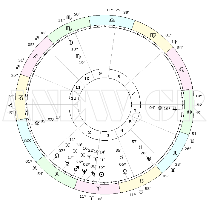 | | ΘΕΣΕΙΣ ΠΛΑΝΗΤΩΝ ΑΣΤΡΟΛΟΓΙΚΟΥ ΧΑΡΤΗ ΤΗΣ ΣΤΙΓΜΗΣ ΑΥΤΗΣ | | | | Πλανήτης | Ζώδιο | Μοίρες | Δεκαήμ. | Σε οίκο | Απόκλιση | | Ακμές των οίκων | | Ηλιος | Κριός | 15°03' | Δεύτερο | 5 | 05 N 56 | | 1ος | 22°39' | Σκορπιός | | Σελήνη | Σκορπιός | 16°09' | Δεύτερο | 12 | 21 S 14 | | 2ος | 22°52' | Τοξότης | | Ερμής | Ιχθείς | 17°19' | Δεύτερο | 4 | 06 S 42 | | 3ος | 27°25' | Αιγόκερως | | Αφροδίτη | Ταύρος | 06°22' | Πρώτο | 6 | 13 N 22 | | 4ος | 03°10' | Ιχθείς | | Αρης | Ιχθείς | 26°07' | Τρίτο | 4 | 02 S 29 | | 5ος | 05°00' | Κριός | | Δίας | Καρκίνος | 16°03' | Δεύτερο | 8 | 22 N 50 | | 6ος | 01°03' | Ταύρος | | Κρόνος | Κριός | 06°08' | Πρώτο | 5 | 00 N 29 | | 7ος | 22°39' | Ταύρος | | Ουρανός | Ταύρος | 28°56' | Τρίτο | 7 | 19 N 45 | | 8ος | 22°52' | Δίδυμοι | | Ποσειδώνας | Κριός | 02°21' | Πρώτο | 4 | 00 S 16 | | 9ος | 27°25' | Καρκίνος | | Πλούτωνας | Υδροχόος | 05°17' | Πρώτο | 3 | 22 S 47 | | 10ος | 03°10' | Παρθένος | | Β. Δεσμός | Ιχθείς | 07°12' | Πρώτο | 4 | 08 S 52 | | 11ος | 05°00' | Ζυγός | | Ωροσκόπος | Σκορπιός | 22°39' | Τρίτο | | | 12ος | 01°03' | Σκορπιός | | Μεσουράνημα | Παρθένος | 03°10' | Πρώτο | | | |