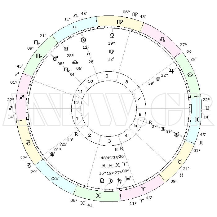 | ΘΕΣΕΙΣ ΠΛΑΝΗΤΩΝ ΑΣΤΡΟΛΟΓΙΚΟΥ ΧΑΡΤΗ ΤΗΣ ΣΤΙΓΜΗΣ ΑΥΤΗΣ | | Πλανήτης | Ζώδιο | Μοίρες | Δεκαήμ. | Σε οίκο | Απόκλιση | | Ακμές των οίκων | Ηλιος | Ζυγός | 12°20' | Δεύτερο | 11 | 04 S 52 | | 1ος | 22°56' | Σκορπιός | Σελήνη | Ιχθείς | 17°21' | Δεύτερο | 4 | 05 S 04 | | 2ος | 23°11' | Τοξότης | Ερμής | Ζυγός | 27°56' | Τρίτο | 11 | 11 S 19 | | 3ος | 27°46' | Αιγόκερως | Αφροδίτη | Παρθένος | 19°25' | Δεύτερο | 10 | 05 N 28 | | 4ος | 03°32' | Ιχθείς | Αρης | Σκορπιός | 08°50' | Πρώτο | 12 | 14 S 33 | | 5ος | 05°21' | Κριός | Δίας | Καρκίνος | 22°58' | Τρίτο | 8 | 21 N 30 | | 6ος | 01°21' | Ταύρος | Κρόνος | Ιχθείς | 27°34'R | Τρίτο | 4 | 03 S 16 | | 7ος | 22°56' | Ταύρος | Ουρανός | Δίδυμοι | 01°07'R | Πρώτο | 7 | 20 N 10 | | 8ος | 23°11' | Δίδυμοι | Ποσειδώνας | Κριός | 00°26'R | Πρώτο | 4 | 01 S 05 | | 9ος | 27°46' | Καρκίνος | Πλούτωνας | Υδροχόος | 01°23'R | Πρώτο | 3 | 23 S 32 | | 10ος | 03°32' | Παρθένος | Β. Δεσμός | Ιχθείς | 16°49' | Δεύτερο | 4 | 05 S 12 | | 11ος | 05°21' | Ζυγός | Ωροσκόπος | Σκορπιός | 22°56' | Τρίτο | | | 12ος | 01°21' | Σκορπιός | Μεσουράνημα | Παρθένος | 03°32' | Πρώτο | | | |