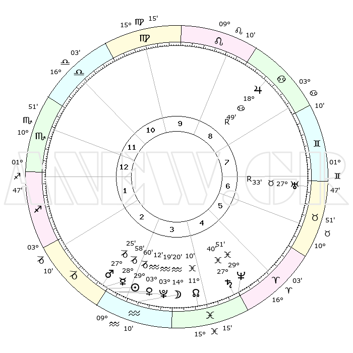 | | ΘΕΣΕΙΣ ΠΛΑΝΗΤΩΝ ΑΣΤΡΟΛΟΓΙΚΟΥ ΧΑΡΤΗ ΤΗΣ ΣΤΙΓΜΗΣ ΑΥΤΗΣ | | | | Πλανήτης | Ζώδιο | Μοίρες | Δεκαήμ. | Σε οίκο | Απόκλιση | | Ακμές των οίκων | | Ηλιος | Αιγόκερως | 29°54' | Τρίτο | 3 | 20 S 10 | | 1ος | 05°47' | Σκορπιός | | Σελήνη | Υδροχόος | 13°12' | Δεύτερο | 4 | 19 S 03 | | 2ος | 04°33' | Τοξότης | | Ερμής | Αιγόκερως | 28°49' | Τρίτο | 3 | 22 S 22 | | 3ος | 07°01' | Αιγόκερως | | Αφροδίτη | Υδροχόος | 03°05' | Πρώτο | 3 | 20 S 33 | | 4ος | 11°37' | Υδροχόος | | Αρης | Αιγόκερως | 27°21' | Τρίτο | 3 | 21 S 40 | | 5ος | 14°26' | Ιχθείς | | Δίας | Καρκίνος | 18°49'R | Δεύτερο | 9 | 22 N 23 | | 6ος | 12°32' | Κριός | | Κρόνος | Ιχθείς | 27°39' | Τρίτο | 5 | 02 S 57 | | 7ος | 05°47' | Ταύρος | | Ουρανός | Ταύρος | 27°33'R | Τρίτο | 7 | 19 N 25 | | 8ος | 04°33' | Δίδυμοι | | Ποσειδώνας | Ιχθείς | 29°50' | Τρίτο | 5 | 01 S 17 | | 9ος | 07°01' | Καρκίνος | | Πλούτωνας | Υδροχόος | 03°19' | Πρώτο | 3 | 23 S 06 | | 10ος | 11°37' | Λέων | | Β. Δεσμός | Ιχθείς | 11°10' | Δεύτερο | 4 | 07 S 23 | | 11ος | 14°26' | Παρθένος | | Ωροσκόπος | Σκορπιός | 05°47' | Πρώτο | | | 12ος | 12°32' | Ζυγός | | Μεσουράνημα | Λέων | 11°37' | Δεύτερο | | | |